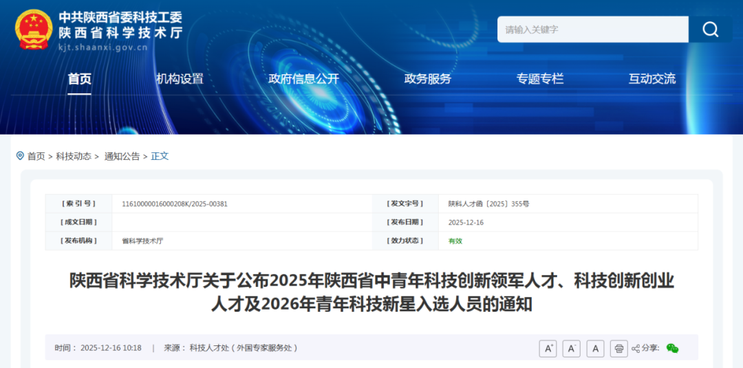 根據《陜西省科學技術廳關于組織推選2025年陜西省中青年科技創新領軍人才、陜西省科技創新創業人才、2026年陜西省青年科技新星的通知》(陜科人才函〔2025〕194號)有關要求,經個人申報、所在單位遴選、主管部門推薦、資格審查、專家評審、會議審定、人員公示等環節,確定西安交通大學杜少毅等100名同志入選2025年陜西省中青年科技創新領軍人才、西安航天發動機有限公司同立軍等50名同志入選2025年陜西省科技創新創業人才、西安交通大學韋安琪等150名同志入選2026年陜西省青年科技新星。