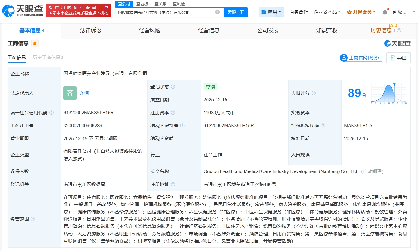 雷達(dá)財(cái)經(jīng)訊,天眼查App顯示,近日,國投健康醫(yī)養(yǎng)產(chǎn)業(yè)發(fā)展(南通)有限公司成立,法定代表人為齊楠,注冊資本約1.16億人民幣,經(jīng)營范圍包括住宿服務(wù)、醫(yī)療服務(wù)、食品銷售、餐飲服務(wù)等。股東信息顯示,該公司由國投健康產(chǎn)業(yè)投資有限公司全資持股。