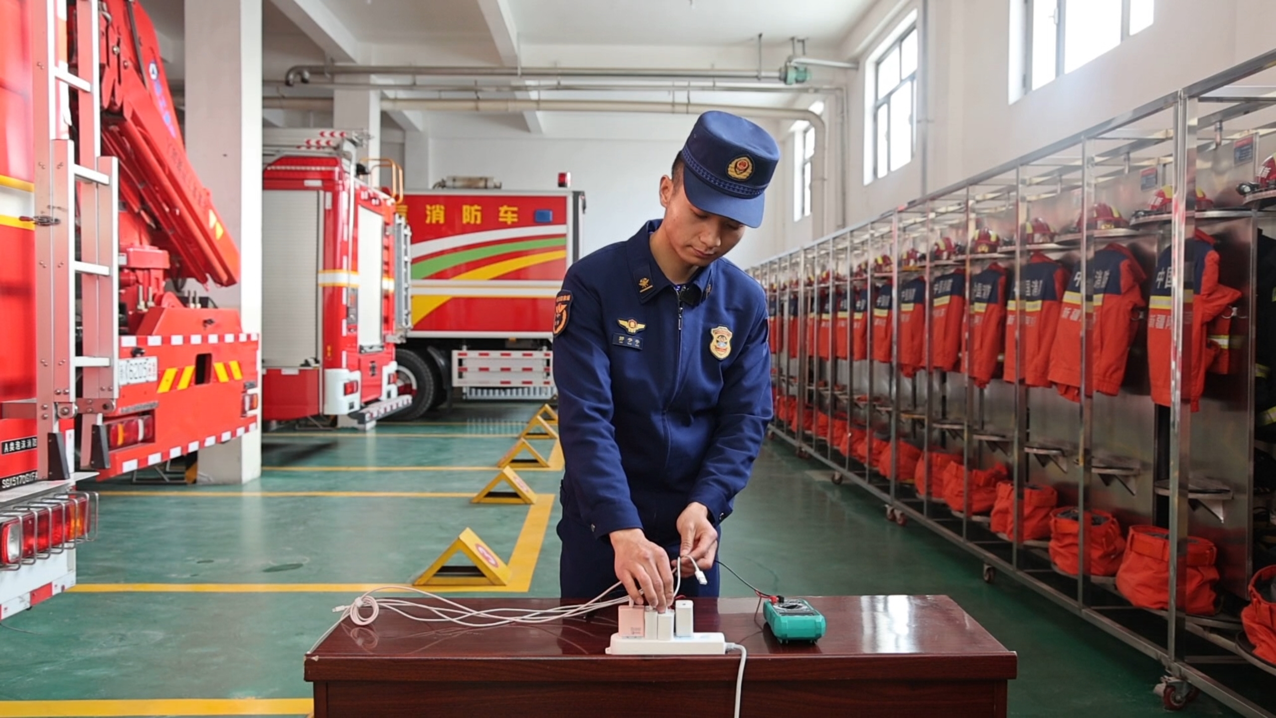 測試開始,消防指戰員將多個不同型號的充電器插入插座,但未連接任何設備,使用專業檢測儀器貼近充電器表面進行測量。