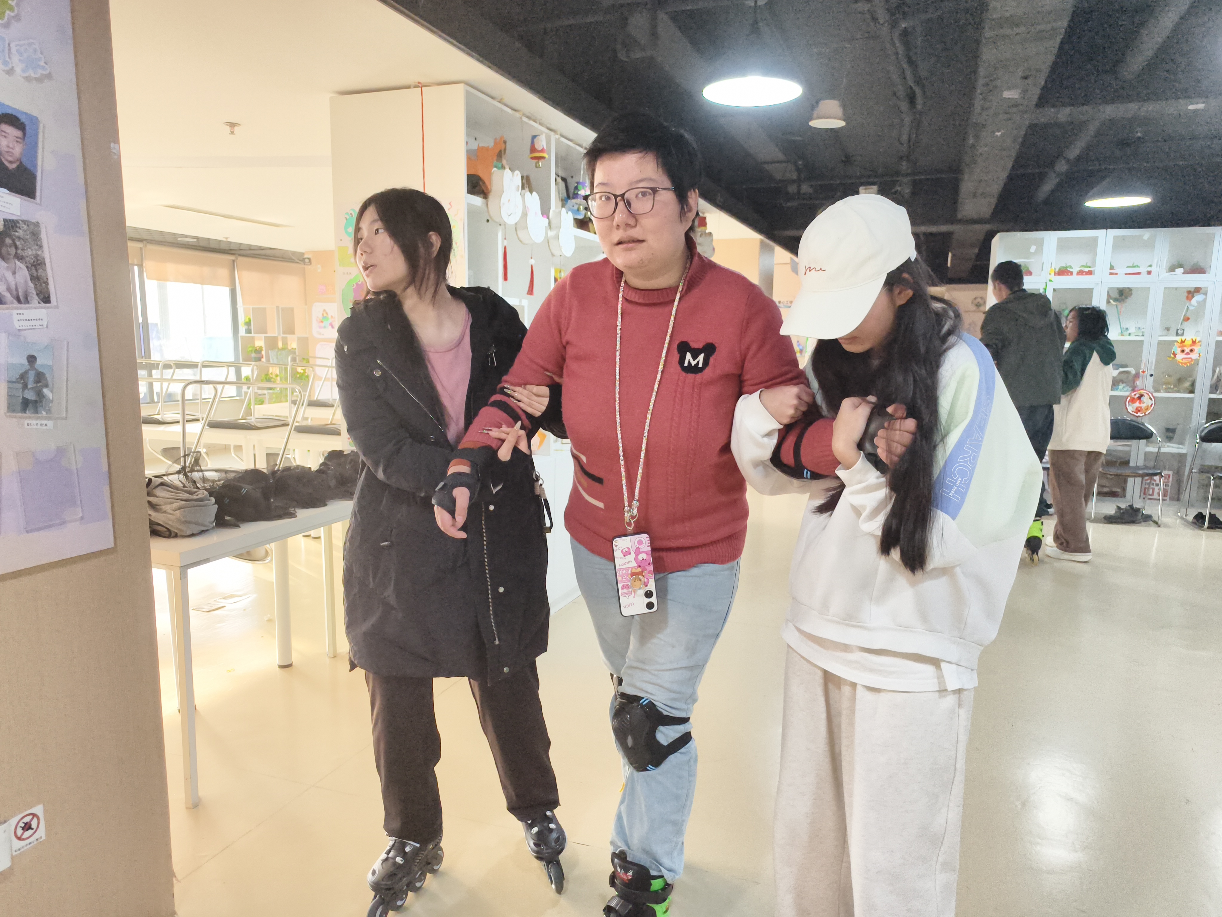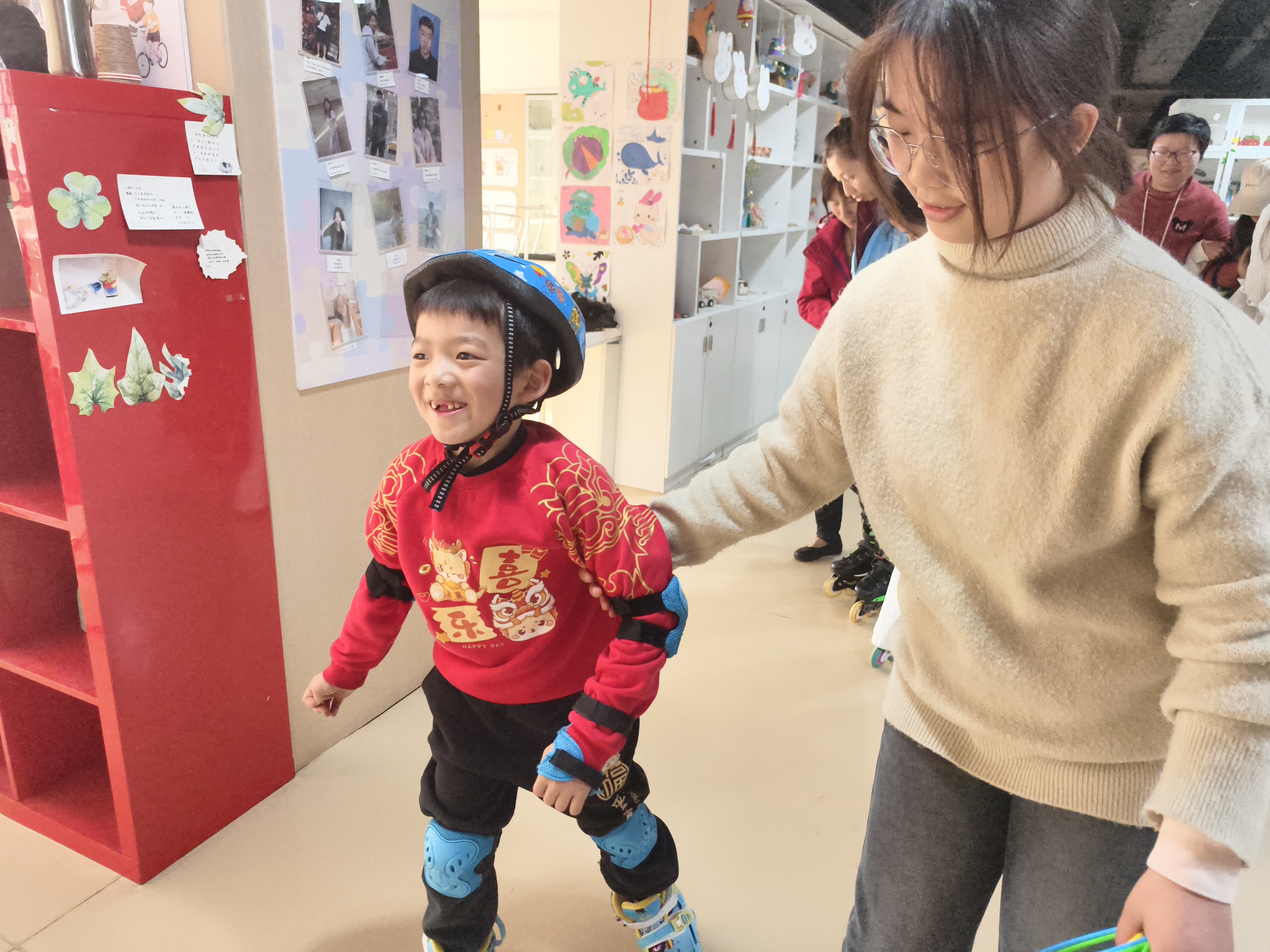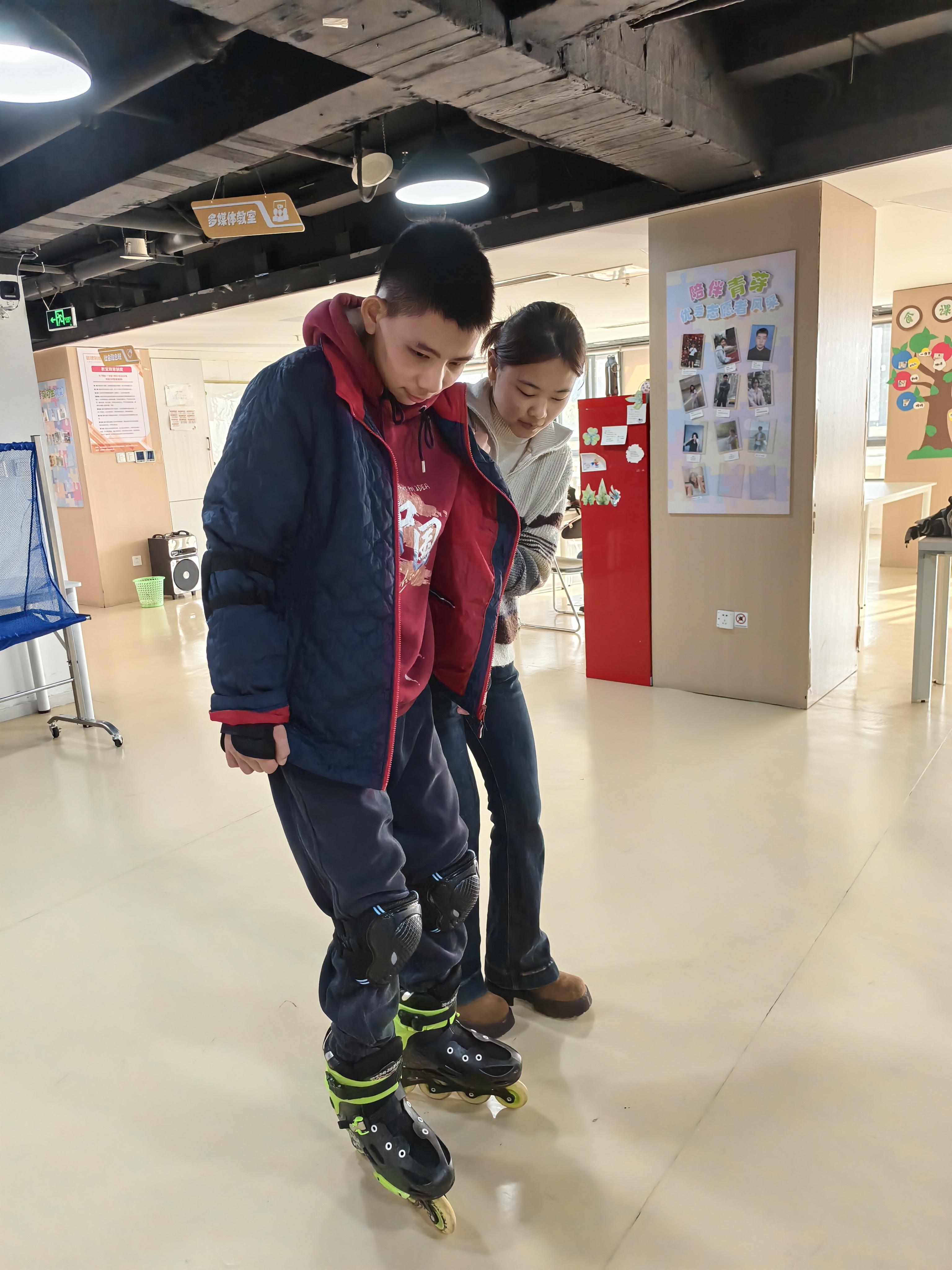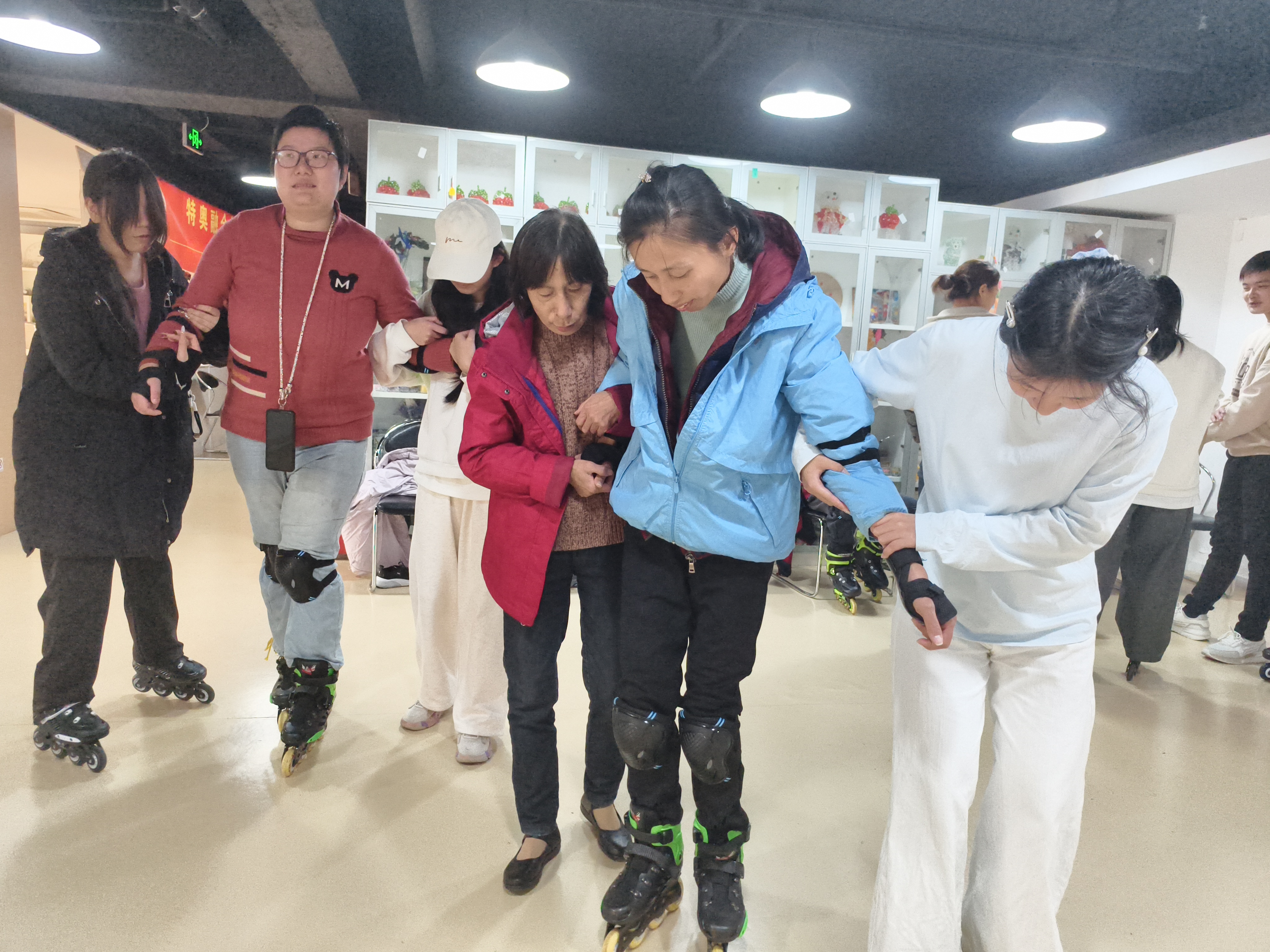 12月6日的室內(nèi)場館,因一場輪滑活動而充滿動感與鼓勵(lì)。在專業(yè)指導(dǎo)和志愿者一對一陪伴下,學(xué)員們從全副武裝、艱難站立開始嘗試。緊緊相握的手,低聲的鼓勵(lì)“我在旁邊”,構(gòu)成了最初的安全網(wǎng)。漸漸地,有人可以蹣跚邁步,有人開始嘗試短距離滑行。當(dāng)一位學(xué)員終于獨(dú)立滑出一段距離,脫口而出“感覺風(fēng)在跑”時(shí),那份純粹的喜悅感染了全場。輪滑在此刻不再是運(yùn)動,它成為突破自我設(shè)限的隱喻,是用身體感知自由與控制的途徑,極大地提升了學(xué)員的空間感與肢體協(xié)調(diào)自信。