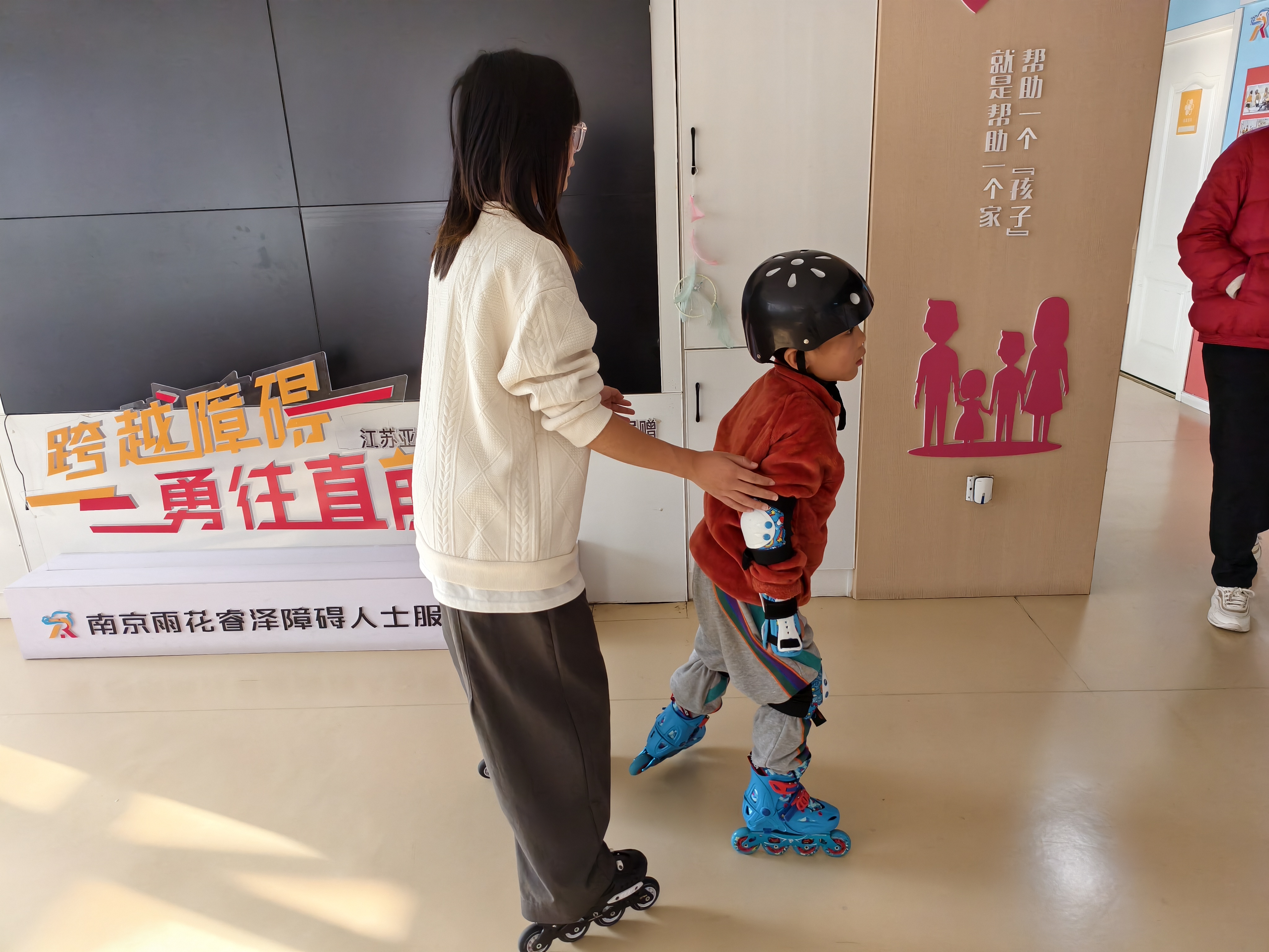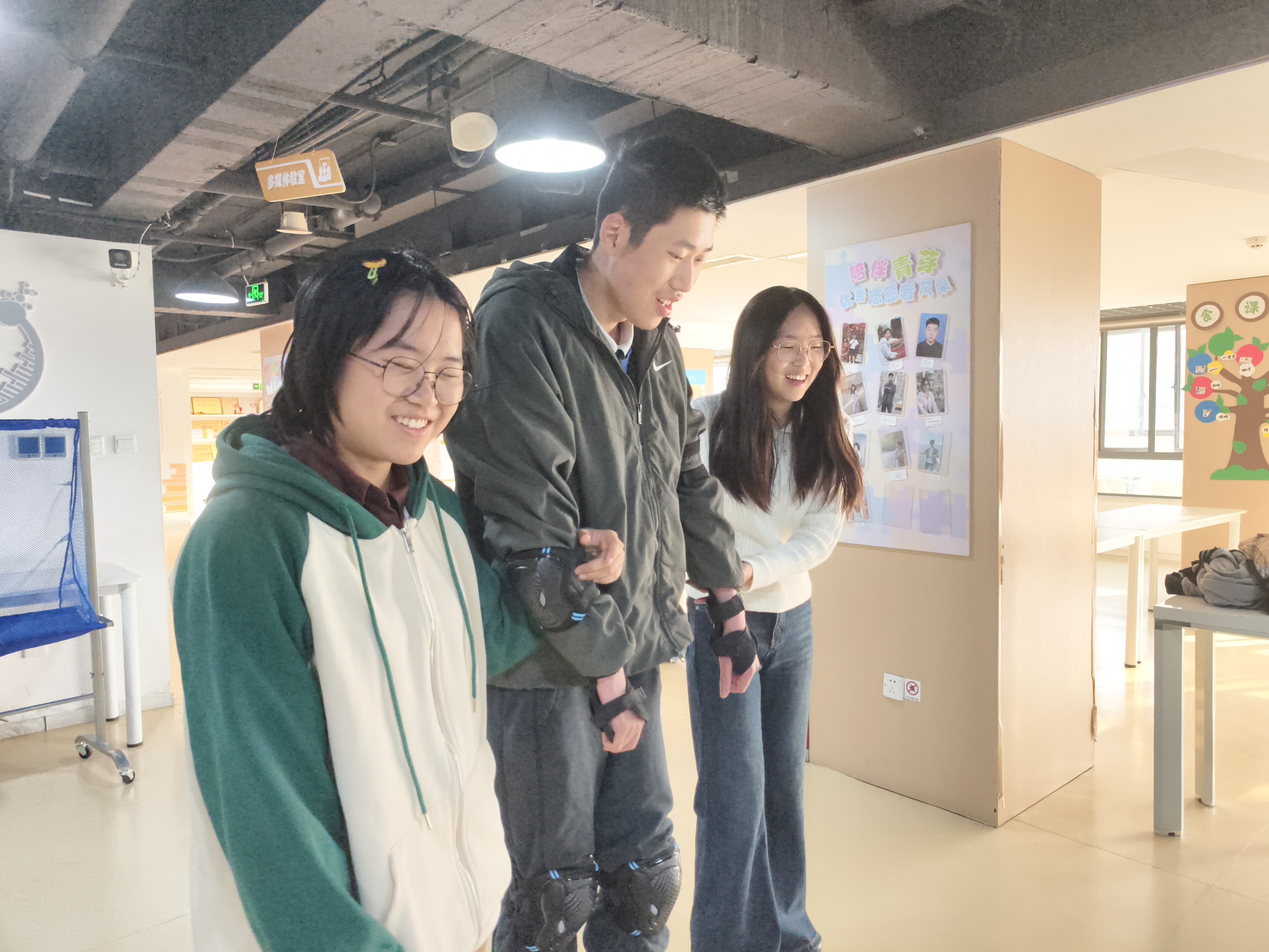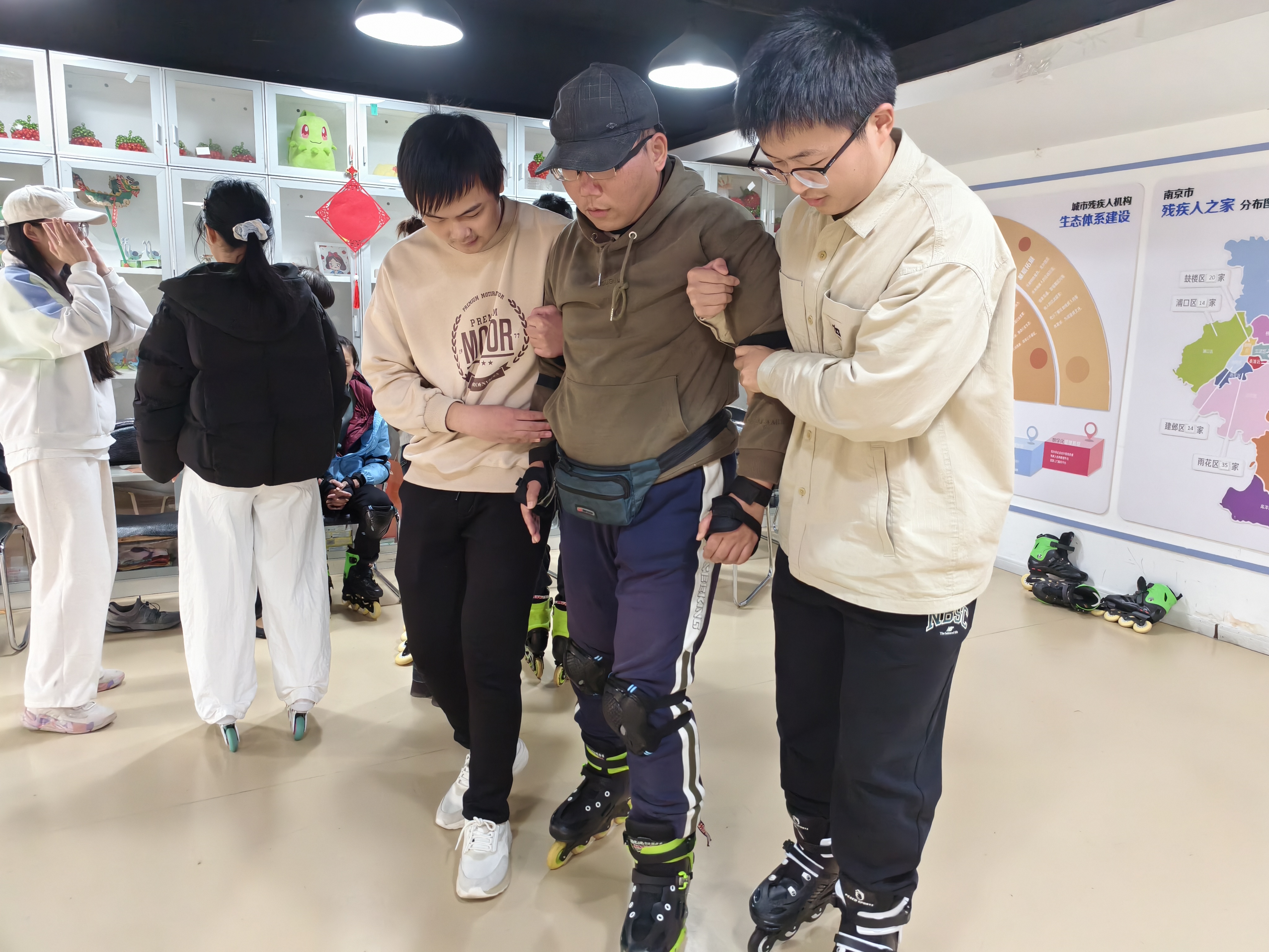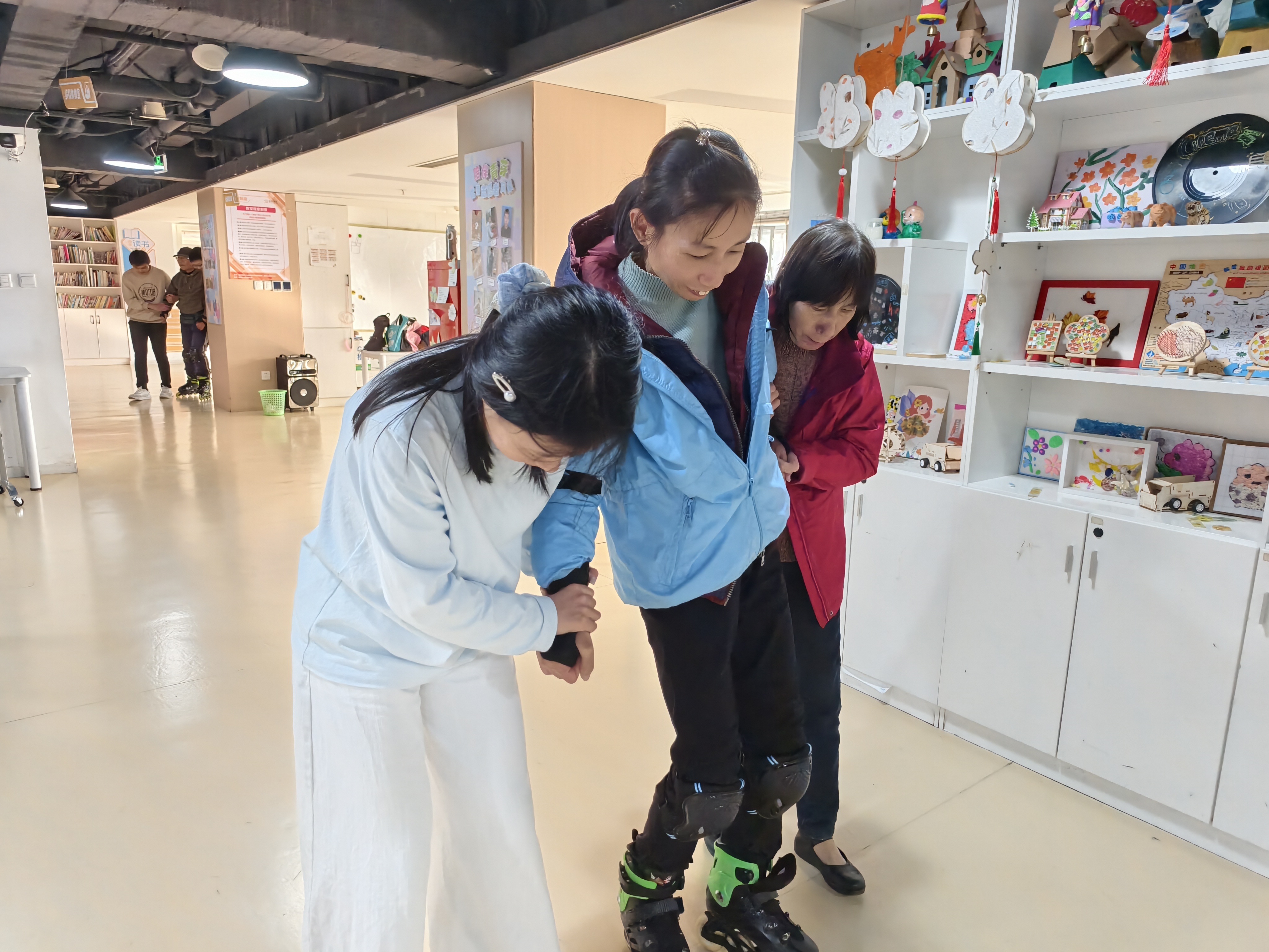 12月6日的室內(nèi)場館,因一場輪滑活動而充滿動感與鼓勵(lì)。在專業(yè)指導(dǎo)和志愿者一對一陪伴下,學(xué)員們從全副武裝、艱難站立開始嘗試。緊緊相握的手,低聲的鼓勵(lì)“我在旁邊”,構(gòu)成了最初的安全網(wǎng)。漸漸地,有人可以蹣跚邁步,有人開始嘗試短距離滑行。當(dāng)一位學(xué)員終于獨(dú)立滑出一段距離,脫口而出“感覺風(fēng)在跑”時(shí),那份純粹的喜悅感染了全場。輪滑在此刻不再是運(yùn)動,它成為突破自我設(shè)限的隱喻,是用身體感知自由與控制的途徑,極大地提升了學(xué)員的空間感與肢體協(xié)調(diào)自信。