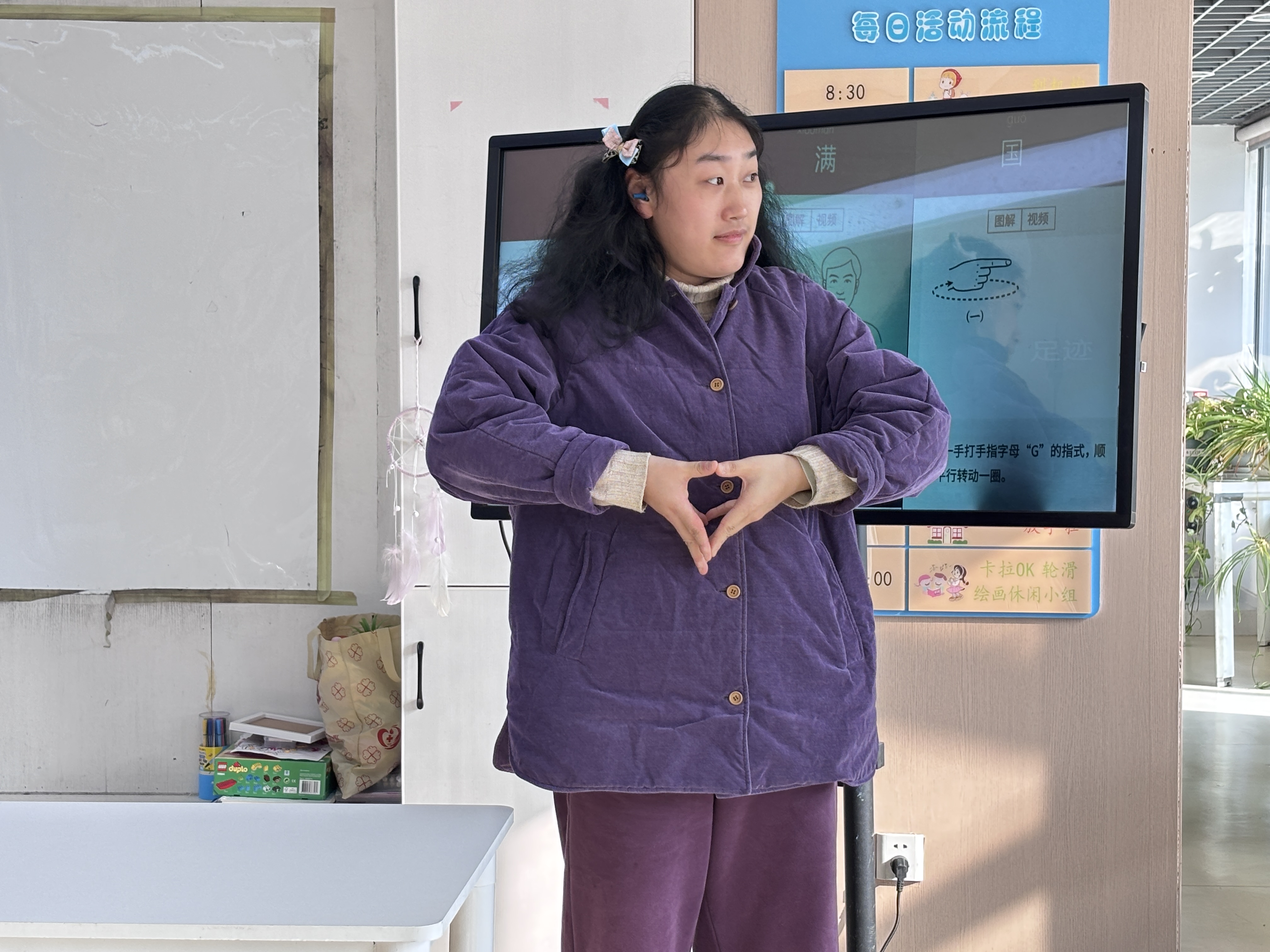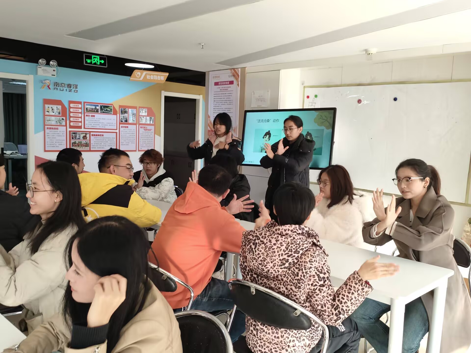 十月至十一月,南京特殊教育師范學(xué)院社會工作協(xié)會的志愿者們帶來了《國家》手語舞教學(xué)。這堂課,聲音退居其次,手勢成為主角。志愿者們巧妙地將歌詞化為形象的動作——“家”是雙手搭成的屋頂,“國”是手掌劃出的輪廓。教學(xué)不再是單向灌輸,而成為一場共同的韻律解碼。當(dāng)音樂流淌,學(xué)員們專注地模仿、練習(xí),最終與志愿者一同用手臂和指尖完成整首曲目的表達(dá)。那一刻的“合唱”無需聲音,整齊與否也不重要,重要的是在共同的節(jié)奏中,一種深沉的情感聯(lián)結(jié)悄然建立,詮釋了“融合”最安靜也最有力的形式。