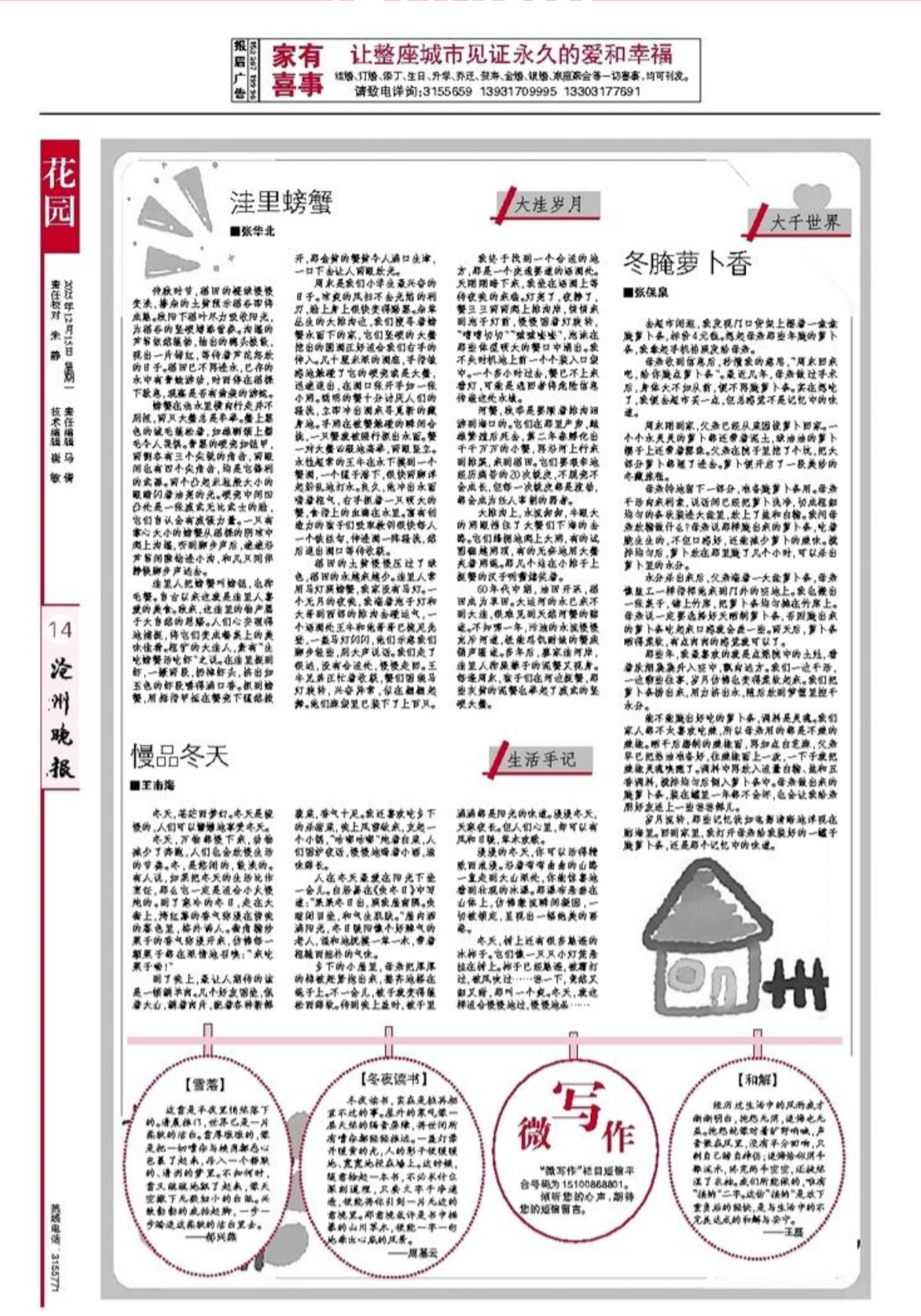 之前一直給這家投過,但沒有被采用,今天文章見報,感謝編輯老師的選稿。根據報紙的版面,我看以散文為主,其中有一個微寫作,100字左右,可以通過短信投過去,這方式還挺新穎的。可以讓更多的作者有上稿的機會。