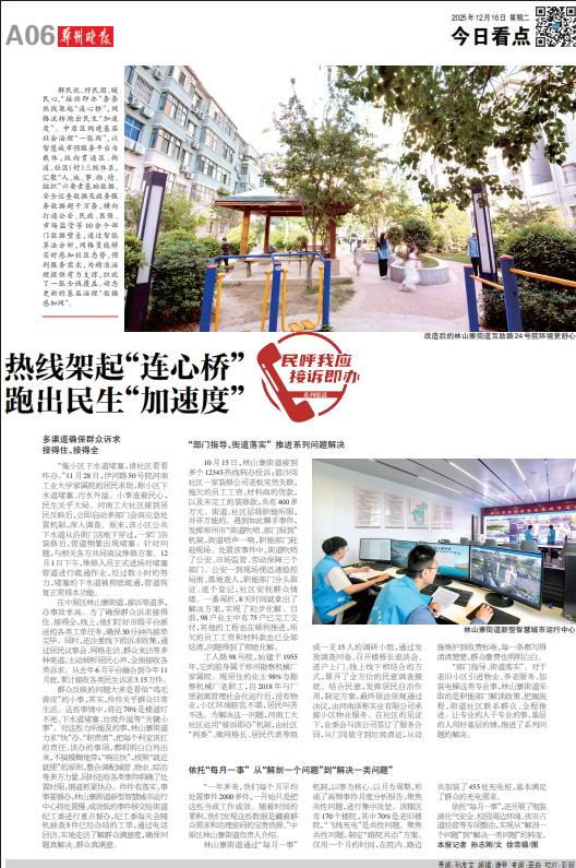 在中原區(qū)林山寨街道,接訴渠道多,辦事效率高。為了確保群眾訴求接得住、接得全,線上,他們盯好市級(jí)平臺(tái)派送的各類工單任務(wù),確保30分鐘內(nèi)接單完畢。同時(shí),還注重線下的訴求收集,通過居民議事會(huì)、網(wǎng)格走訪、群眾來訪等多種渠道,主動(dòng)傾聽居民心聲,全面接收各類訴求。從去年6月平臺(tái)融合到今年11月底,累計(jì)接收各類民生訴求3.15萬件。