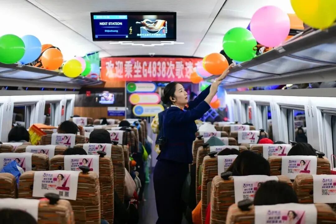 三是多措并舉賦能冰雪經濟。隨著雪季到來,鐵路部門推行一系列便民利民惠民服務舉措,服務旅客暢享冰雪旅游和冰雪運動,助推冰雪經濟持續升溫。北京局集團公司在京張高鐵試點推出“雪具便利行”服務,旅客線上預約成功后可隨車攜帶雪具并存放在列車指定位置,實現人和雪具隨車同行,“坐著高鐵去滑雪”將更加方便快捷。同時,每周末增開京張高鐵崇禮方向高峰線列車10列,“星光·燕趙號”旅游列車新增張家口、宣化等站點,串聯優質冬季旅游資源,有效滿足雪季周末出游需求。哈爾濱局集團公司積極適應冬季旅游市場需求,對“悠享龍江·銀旅號”“大興安嶺號”“伊春號”等品牌旅游列車進行優化升級,提供特色旅拍、非遺文化互動等別具特色的冬季旅行體驗。沈陽局集團公司加開多趟長春至北京、松原、長白山等方向的旅客列車,并對吉林至北京朝陽的G928次、長春至烏蘭浩特的C503次等列車實施重聯運行,延吉西、琿春等車站備有姜茶、暖貼、凍傷膏等防寒物資,為旅客驅散寒意,長白山站設置“暖暖屋”,供旅客在舒適環境中更換衣物。呼和浩特局集團公司烏蘭察布、集寧南、興和北等車站優化冰雪游研學團體進出站流程,開辟綠色通道、安排候車專區,為雪具開辟專用安檢通道,營造方便、溫馨的出行環境。烏魯木齊局集團公司開行夕發朝至的“冬戀喀禾”旅游專列,旅客可實現“晝游夜行”,方便游覽“中國雪都”阿勒泰及喀納斯、禾木等地的冰雪風光,車上設雪具存放區,為滑雪愛好者提供便利。