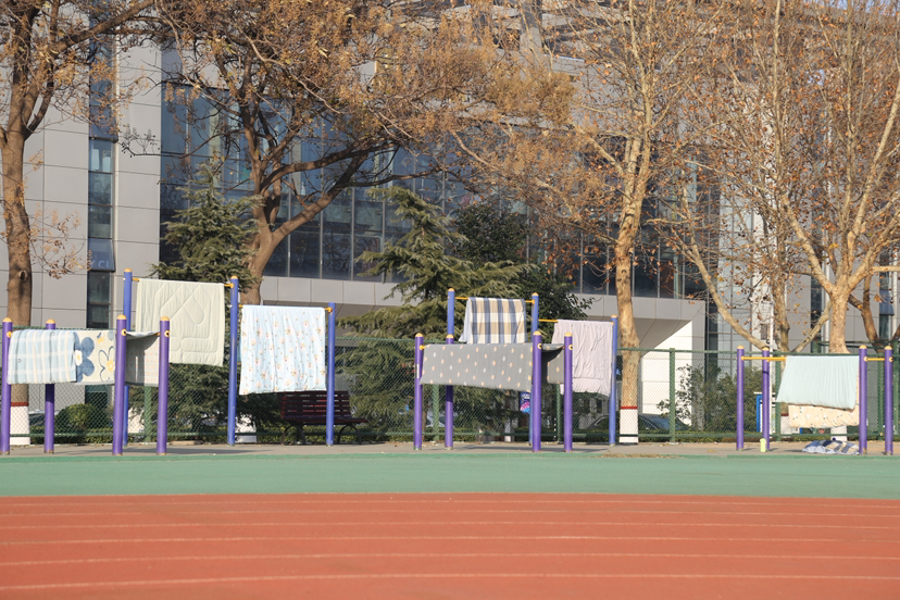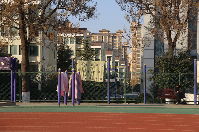 紅色的塑膠跑道旁,健身器材上晾滿了各色的被子和衣物,陽光灑下來,連布料的紋路都透著暖洋洋的味道。