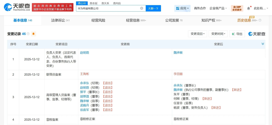 據(jù)財聯(lián)社消息,天眼查工商信息顯示,近日,華為終端有限公司發(fā)生工商變更,郭平卸任董事長,由余承東接任,孟晚舟、徐直軍等卸任董事,同時,多位高管發(fā)生變更。
