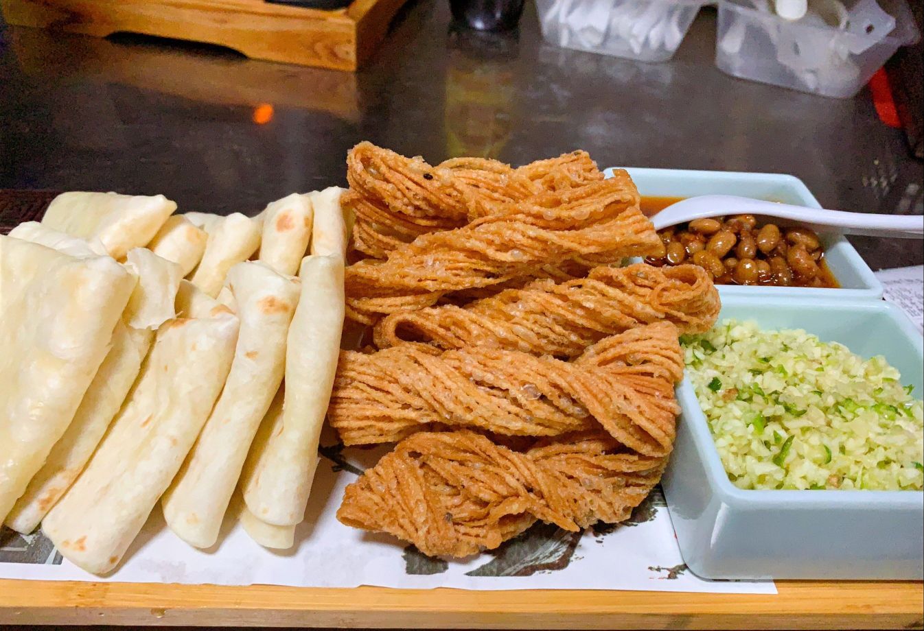 粉漿面條熱豆腐,五香驢肉腌制成。