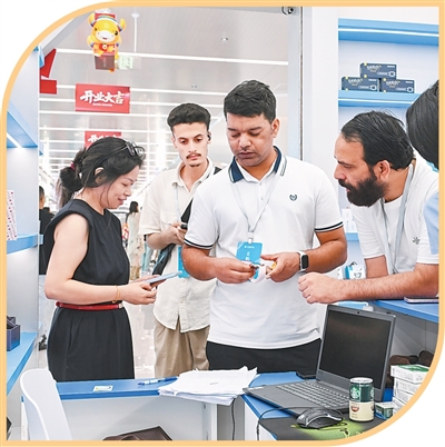 在義烏全球數(shù)貿(mào)中心,外國客商與經(jīng)營戶洽談采購事宜。王懌杰攝