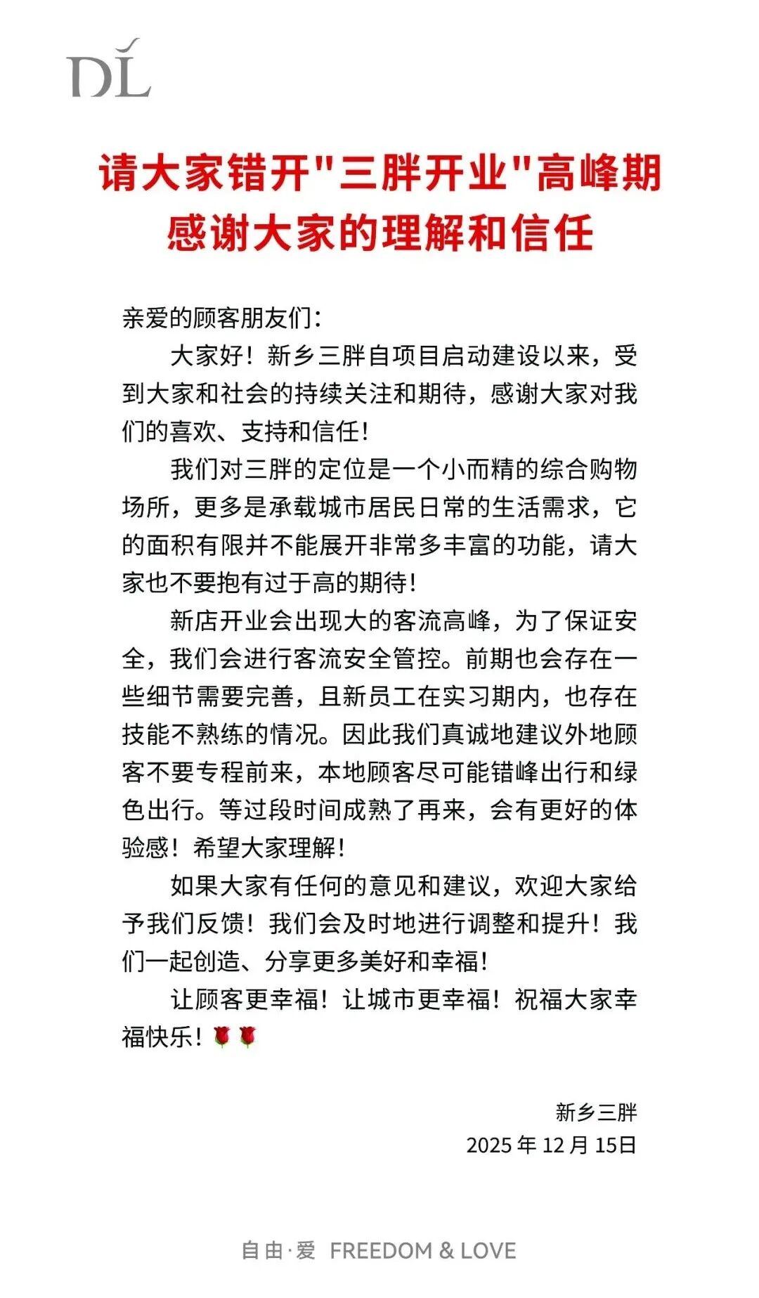 12月15日,胖東來發布重要提醒稱,請大家錯開新鄉胖東來三胖門店開業高峰期。新鄉三胖店自項目啟動建設以來,受到大家和社會的持續關注和期待,感謝大家的喜歡、支持和信任!
