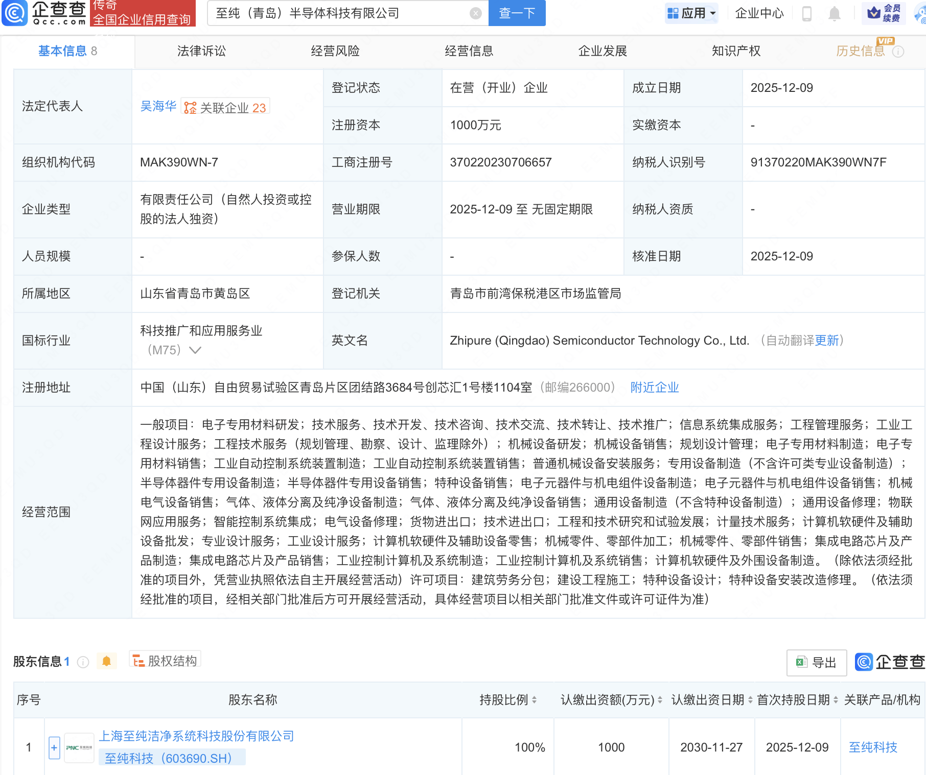 企查查APP顯示,近日,至純(青島)半導體科技有限公司成立,經營范圍包含:半導體器件專用設備制造;半導體器件專用設備銷售;集成電路芯片及產品制造;集成電路芯片及產品銷售等。企查查股權穿透顯示,該公司由至純科技(603690)全資持股。