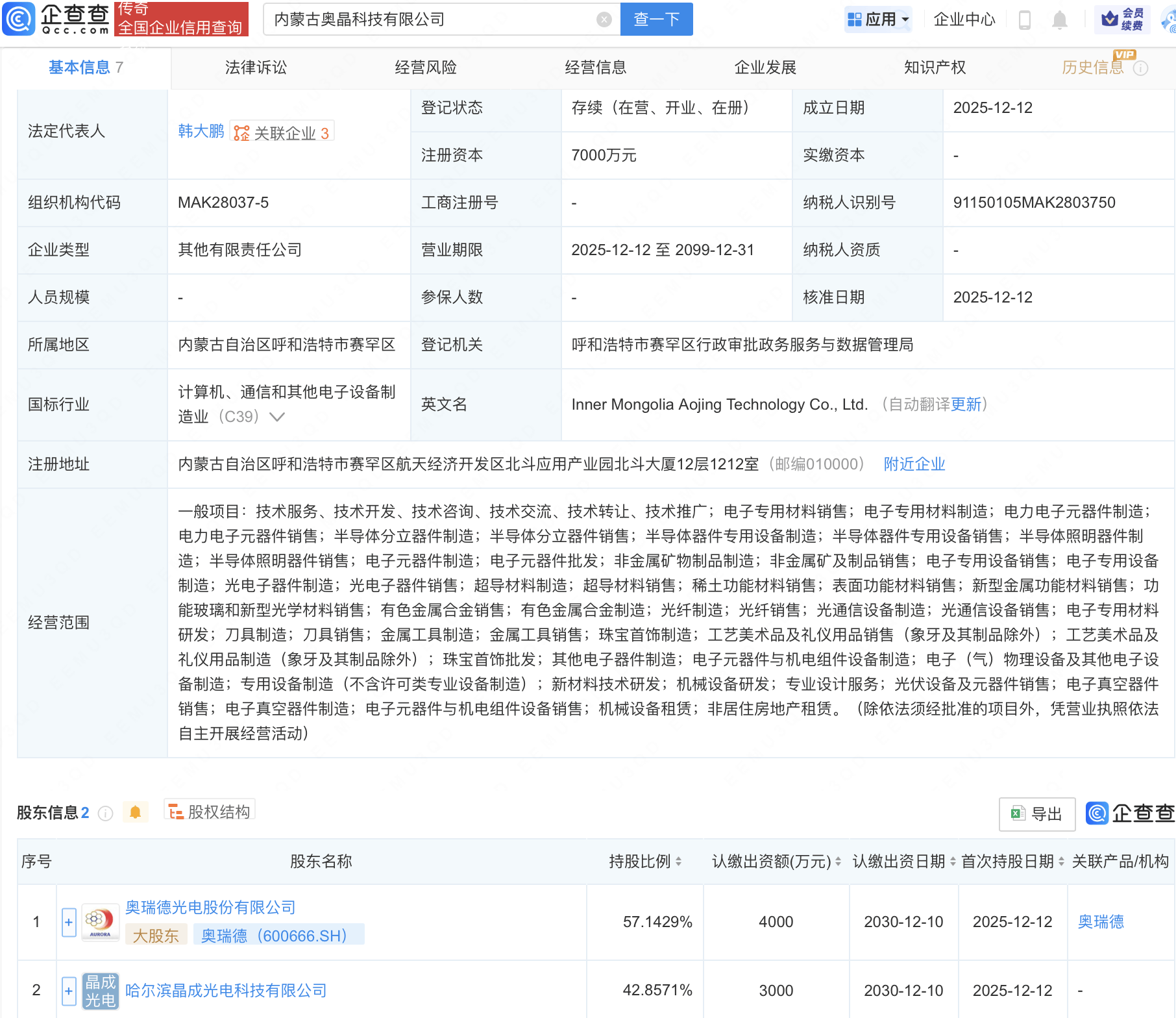 企查查APP顯示,近日,內蒙古奧晶科技有限公司成立,注冊資本7000萬元,經營范圍包含:半導體分立器件制造;半導體分立器件銷售;半導體器件專用設備制造;半導體器件專用設備銷售;半導體照明器件制造等。企查查股權穿透顯示,該公司由奧瑞德(600666)等共同持股。
