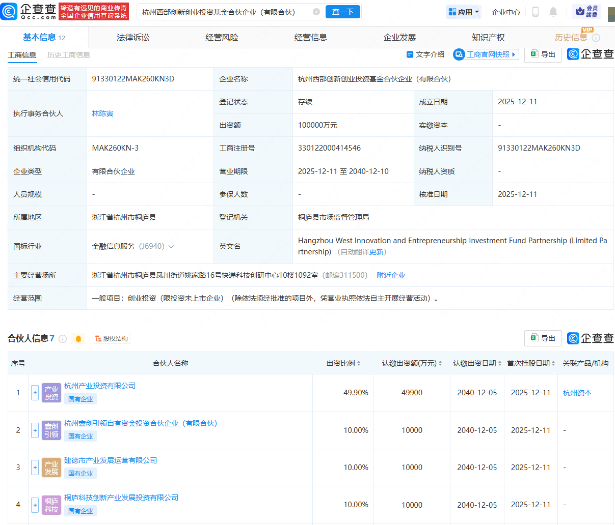 企查查APP顯示,近日,杭州西部創(chuàng)新創(chuàng)業(yè)投資基金合伙企業(yè)(有限合伙)成立,出資額10億人民幣,經(jīng)營范圍為創(chuàng)業(yè)投資。企查查股權穿透顯示,該合伙企業(yè)由杭州產(chǎn)業(yè)投資有限公司、桐廬科技創(chuàng)新產(chǎn)業(yè)發(fā)展投資有限公司、杭州資向未來企業(yè)管理有限公司等共同出資。