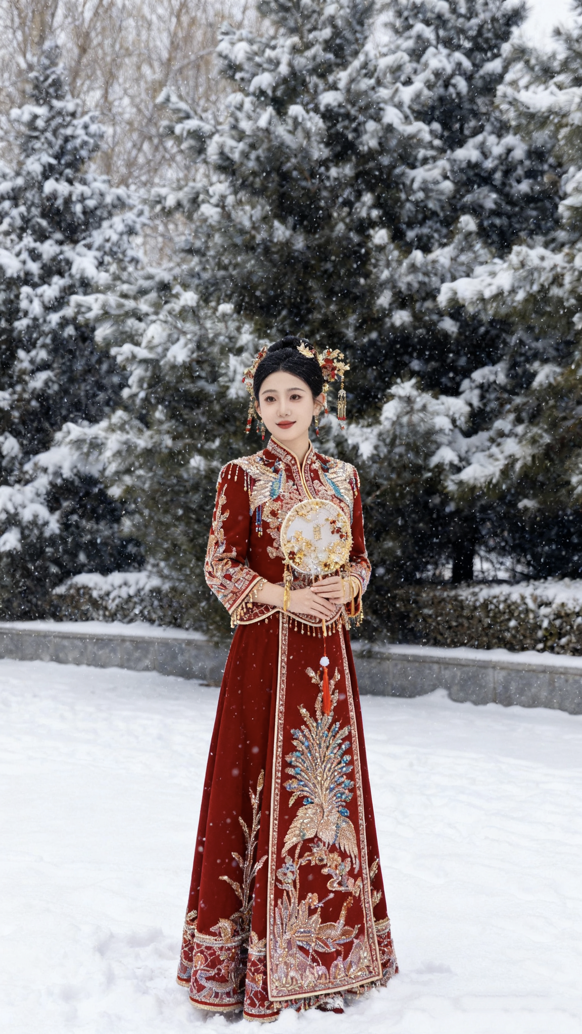鏡頭里的女子身著酒紅色秀禾,絨面的衣料在落雪中泛著溫潤的光澤,金線繡就的鳳凰紋樣順著裙擺蜿蜒,藍(lán)紅相間的珠飾點(diǎn)綴其間,似將江南的婉約與北方的豪邁揉進(jìn)了一針一線。她手持團(tuán)扇,扇面的鎏金紋樣與發(fā)間的步搖相映,雪花落在發(fā)梢、肩頭,白與紅的碰撞,冷與暖的交融,讓中式嫁衣的精致在雪色里愈發(fā)鮮活。