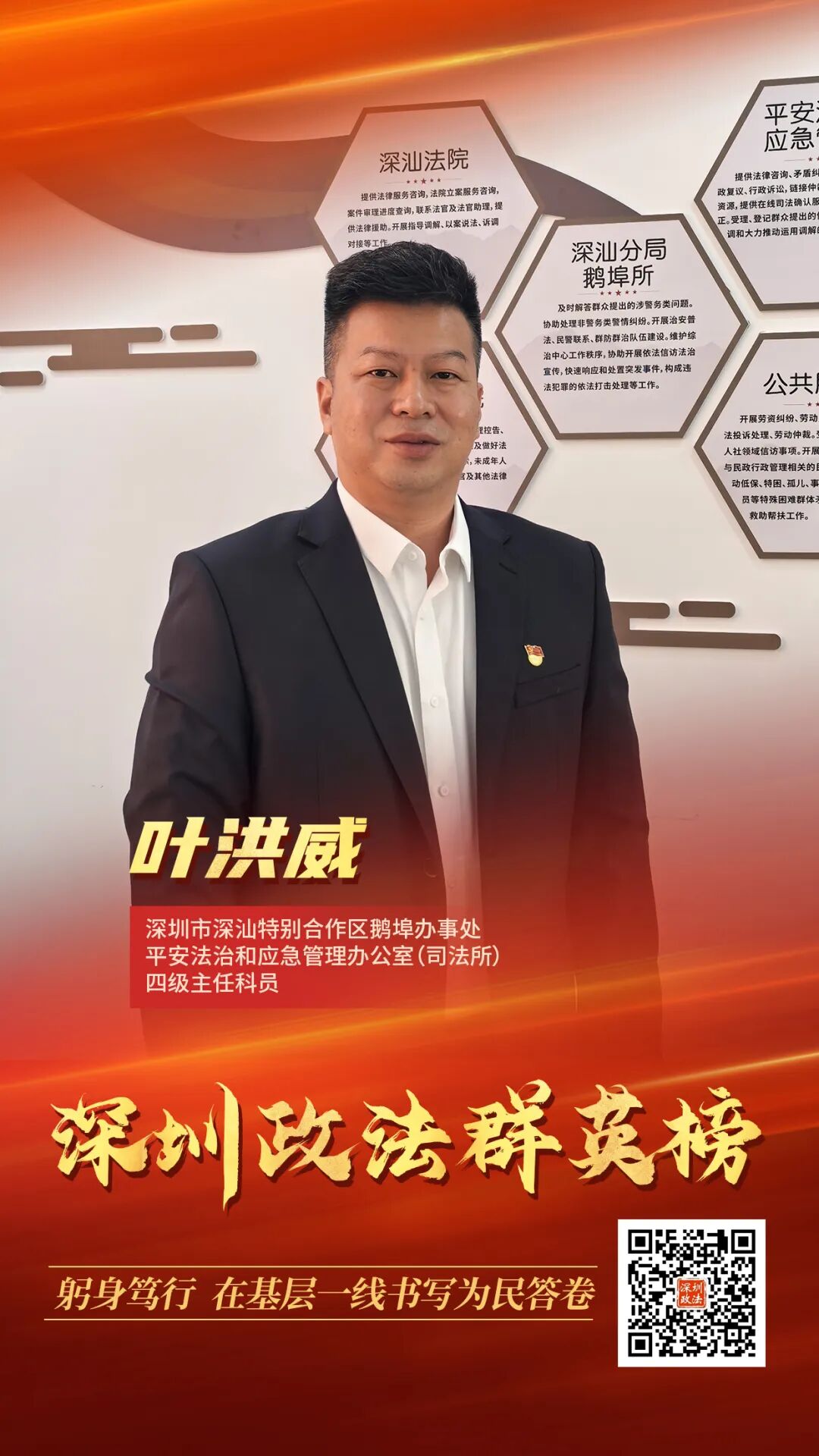 今天,“政法群英榜”欄目推出第38期政法人物,講述深圳市深汕特別合作區鵝埠辦事處優秀干警葉洪威的故事。