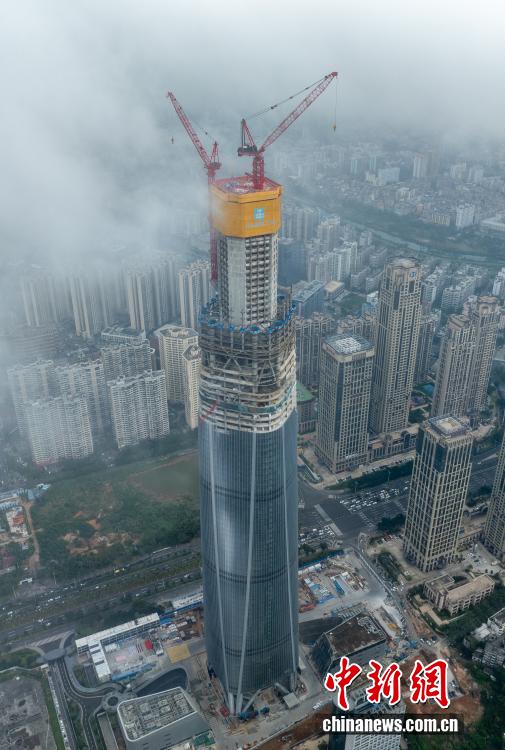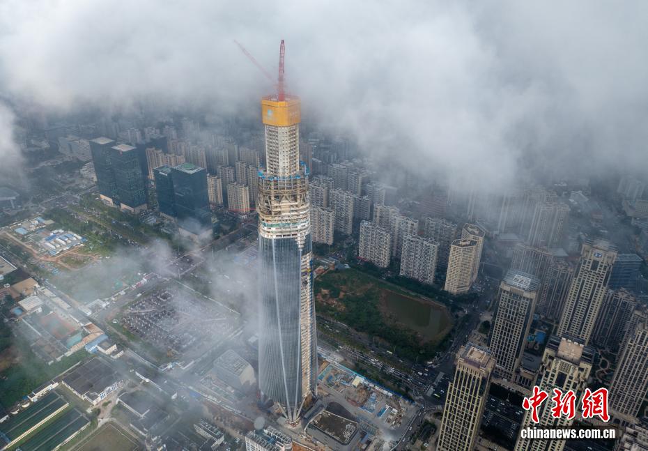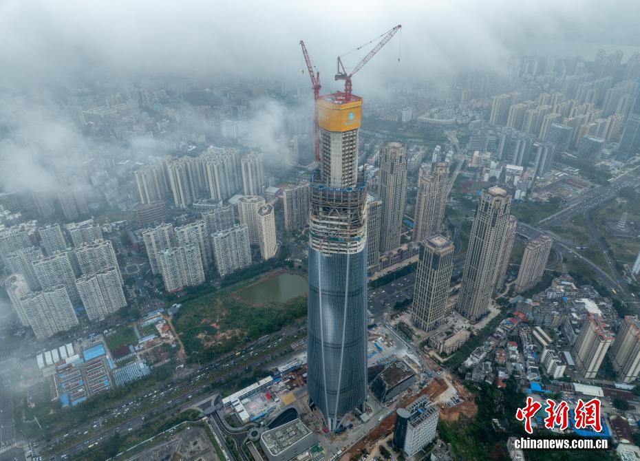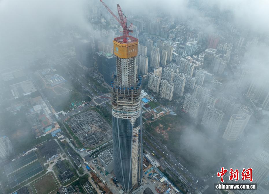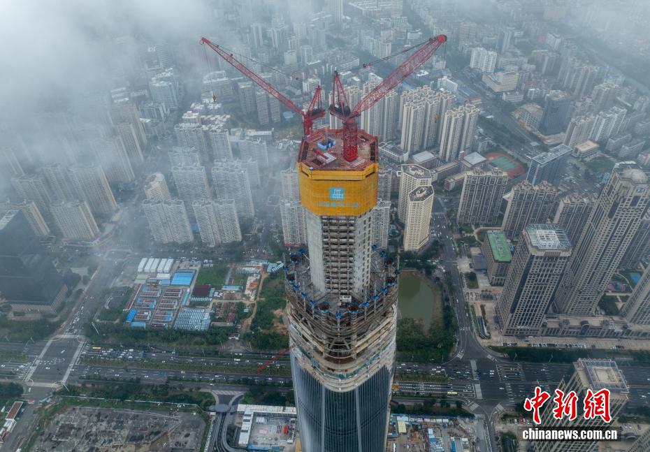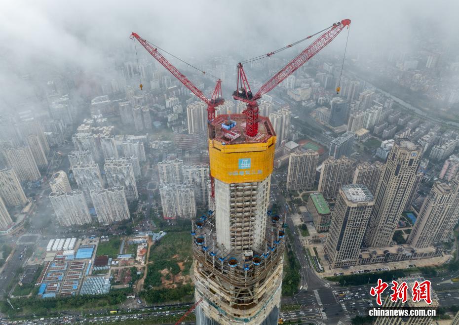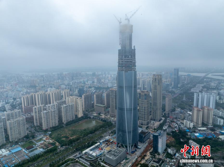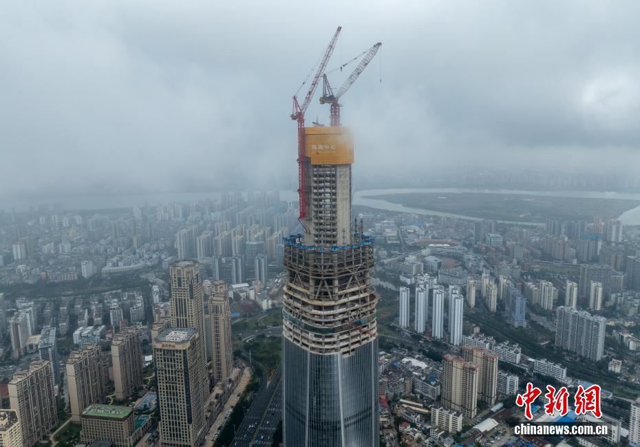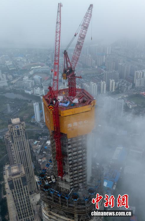 12月16日,海南海口,在海南全島封關運作進入最后沖刺階段的關鍵時刻,由海南控股旗下海南機場投資建設、中建三局承建的“海南第一高樓”海南中心項目順利完成塔樓核心筒結構封頂,項目核心結構正式成型。海南中心項目總高度428米,當前建設高度達402米,已經刷新海南城市物理天際線。(無人機照片)