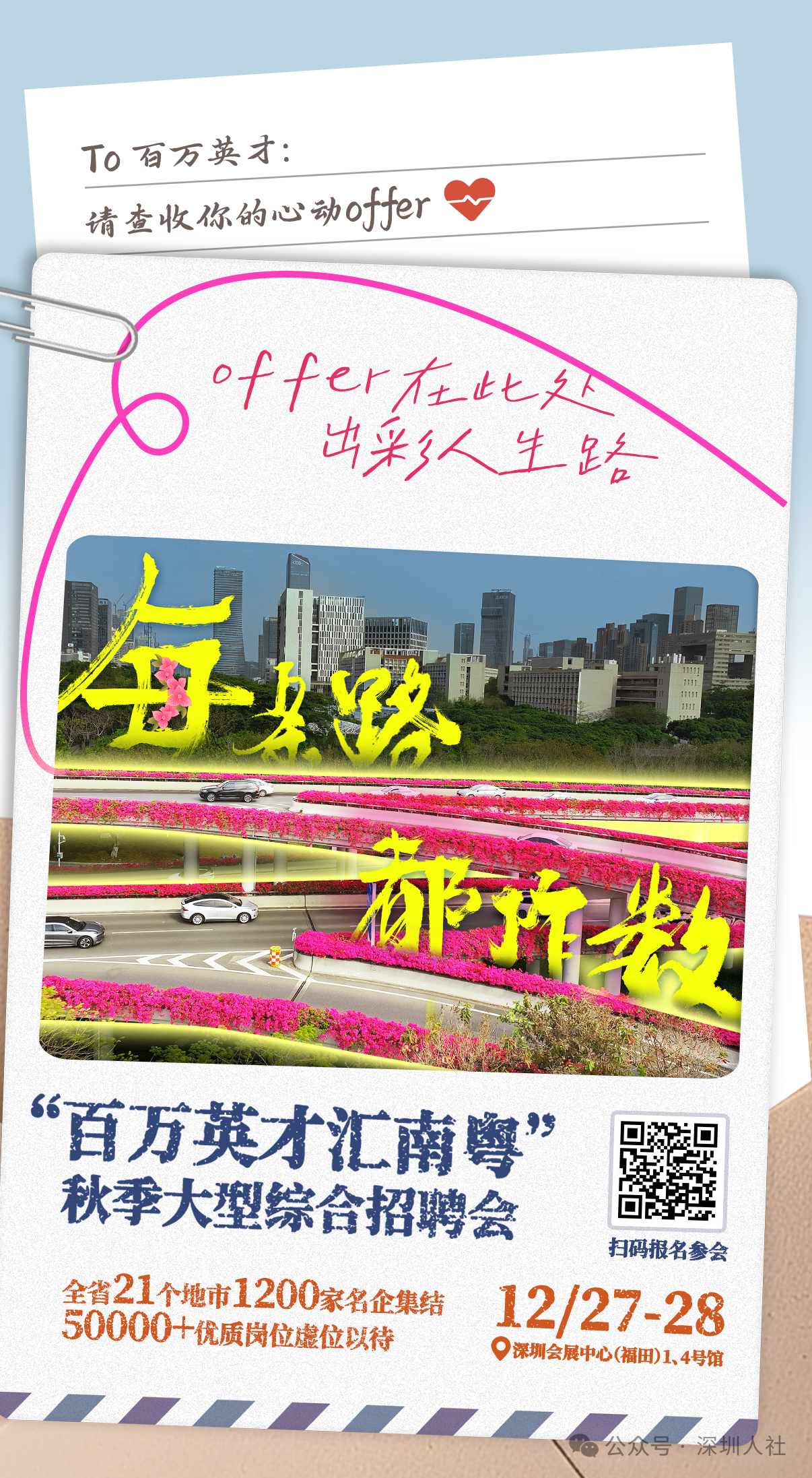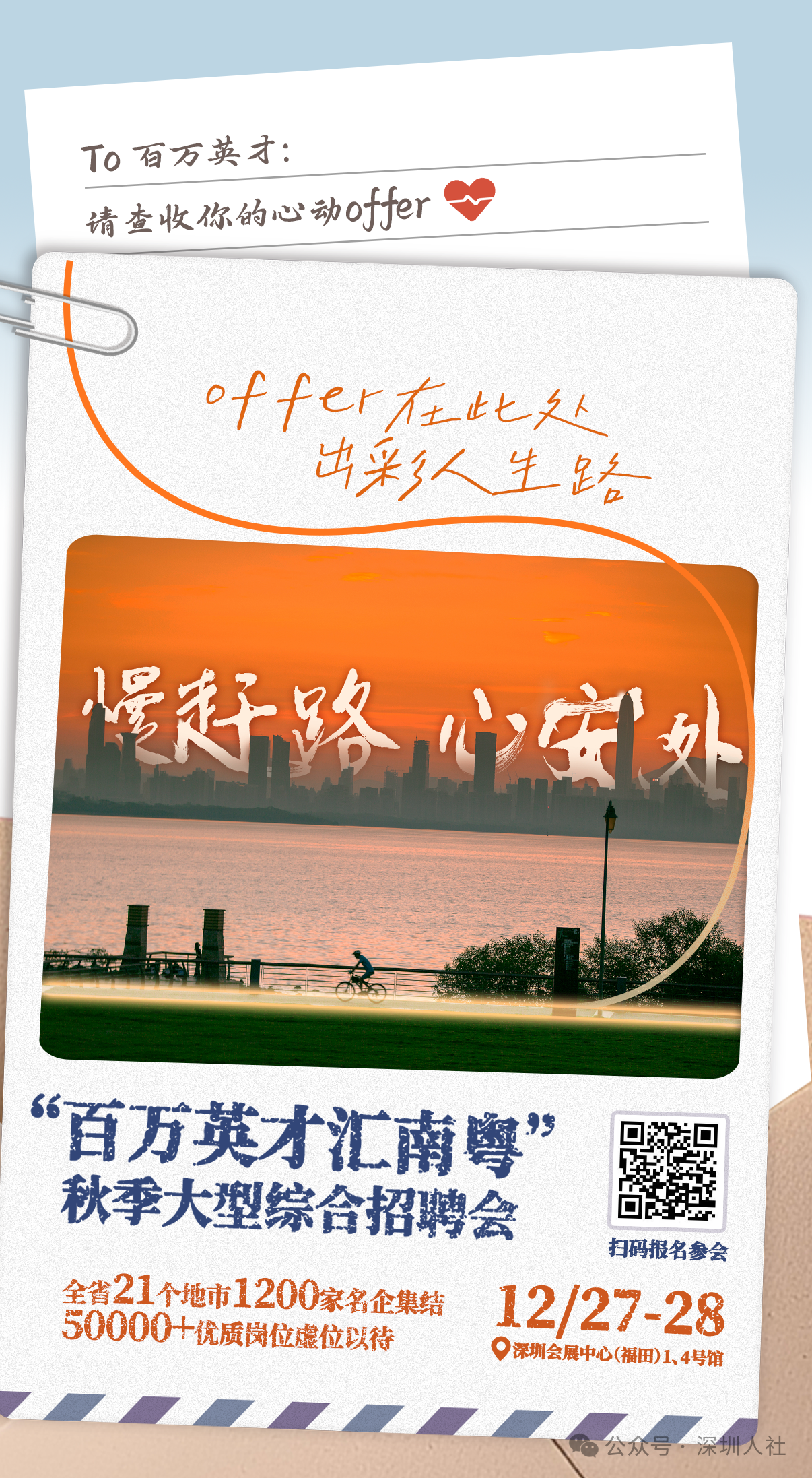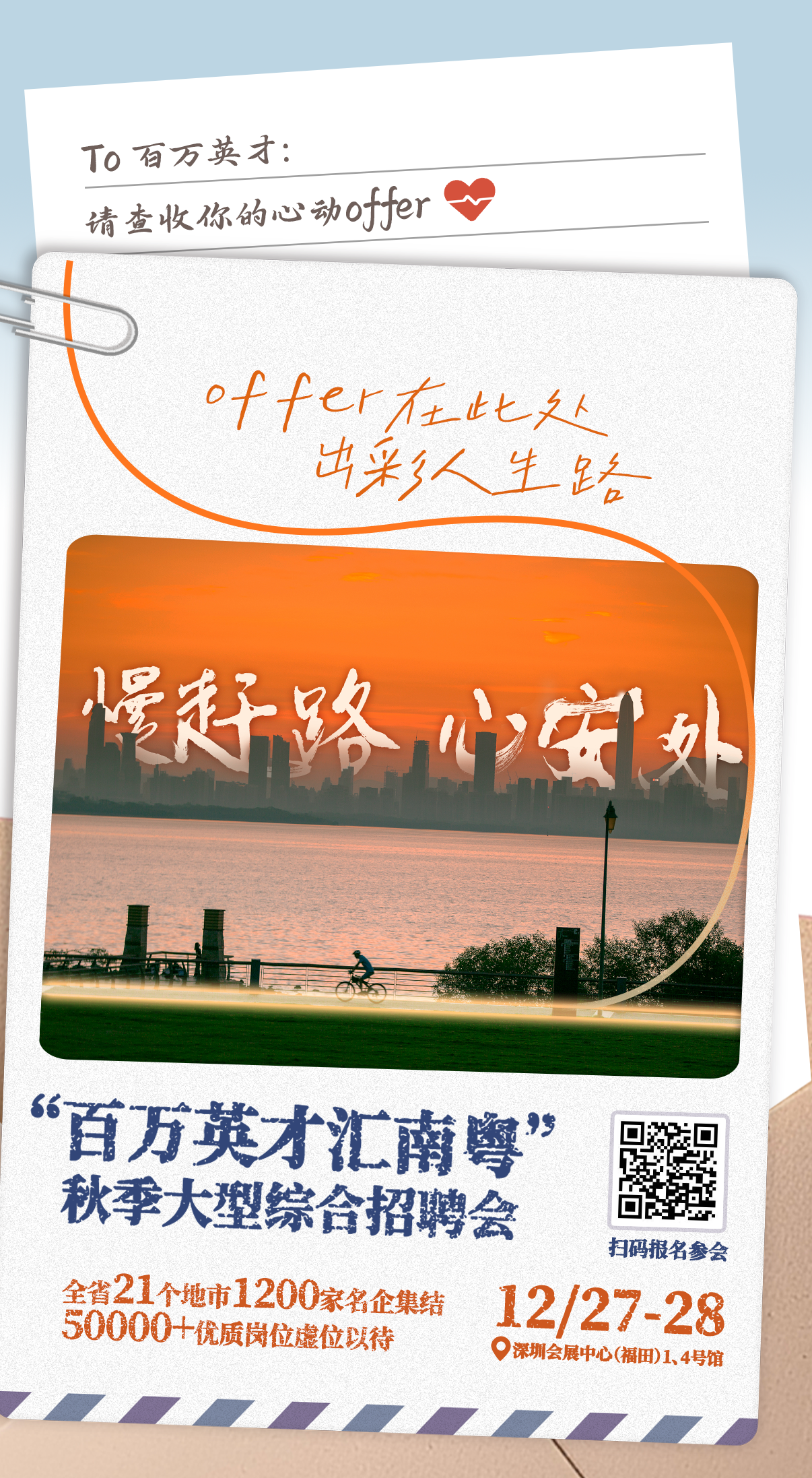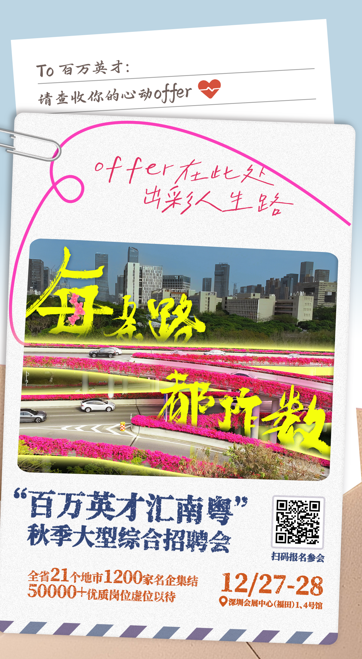 「百萬英才匯南粵」大型綜合招聘會即將來襲!全省21個地市、1200家名企攜手集結華為、騰訊、比亞迪、小鵬、格力等龍頭企業“組團”招聘50000+優質崗位虛位以待只為向你發出那一份“心動offer”我們誠邀各位青春合伙人在南粵大地感受發展的速度理想的廣度生活的溫度從這里出發踏上出彩人生路 時間:12月27日-28日 地點:深圳會展中心(福田)1、4號館 掃碼報名,直達機遇現場我們期待與你相遇一起書寫下一段精彩篇章