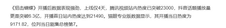 《狙擊蝴蝶》實現話題與播放雙高,開播沒幾集,相關播放量突破六億大關,好不風光。