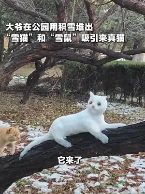 大爺用雪做“貓捉老鼠” 引來真貓圍觀