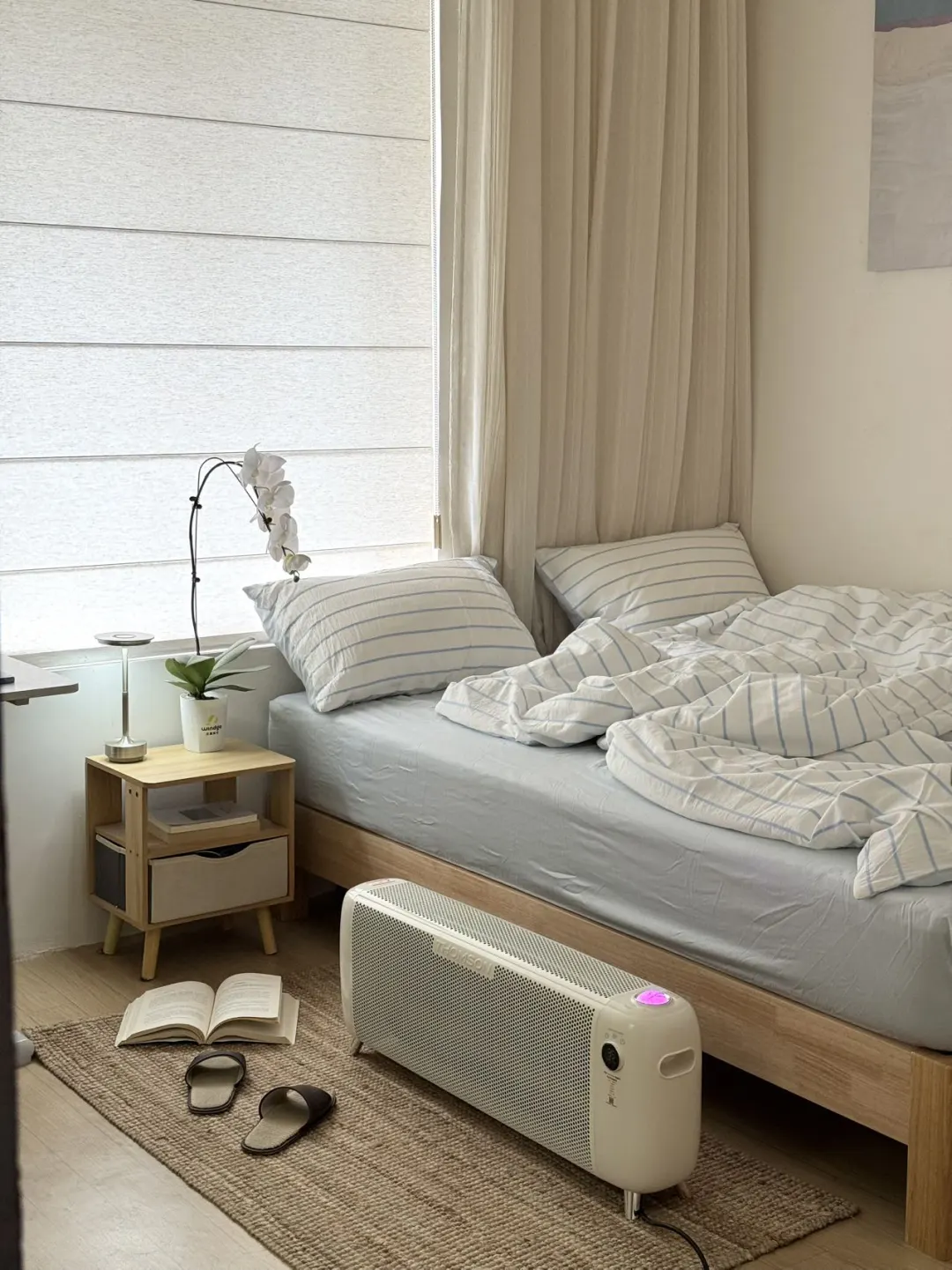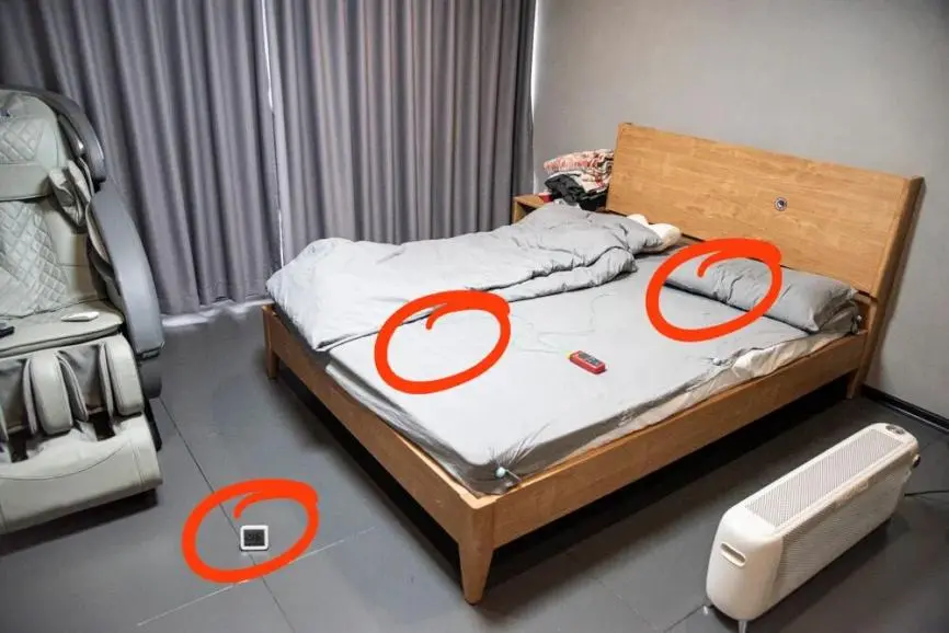 ?在二十平米的房間,將電暖器統一放在在圖片右側靠近床頭的位置。