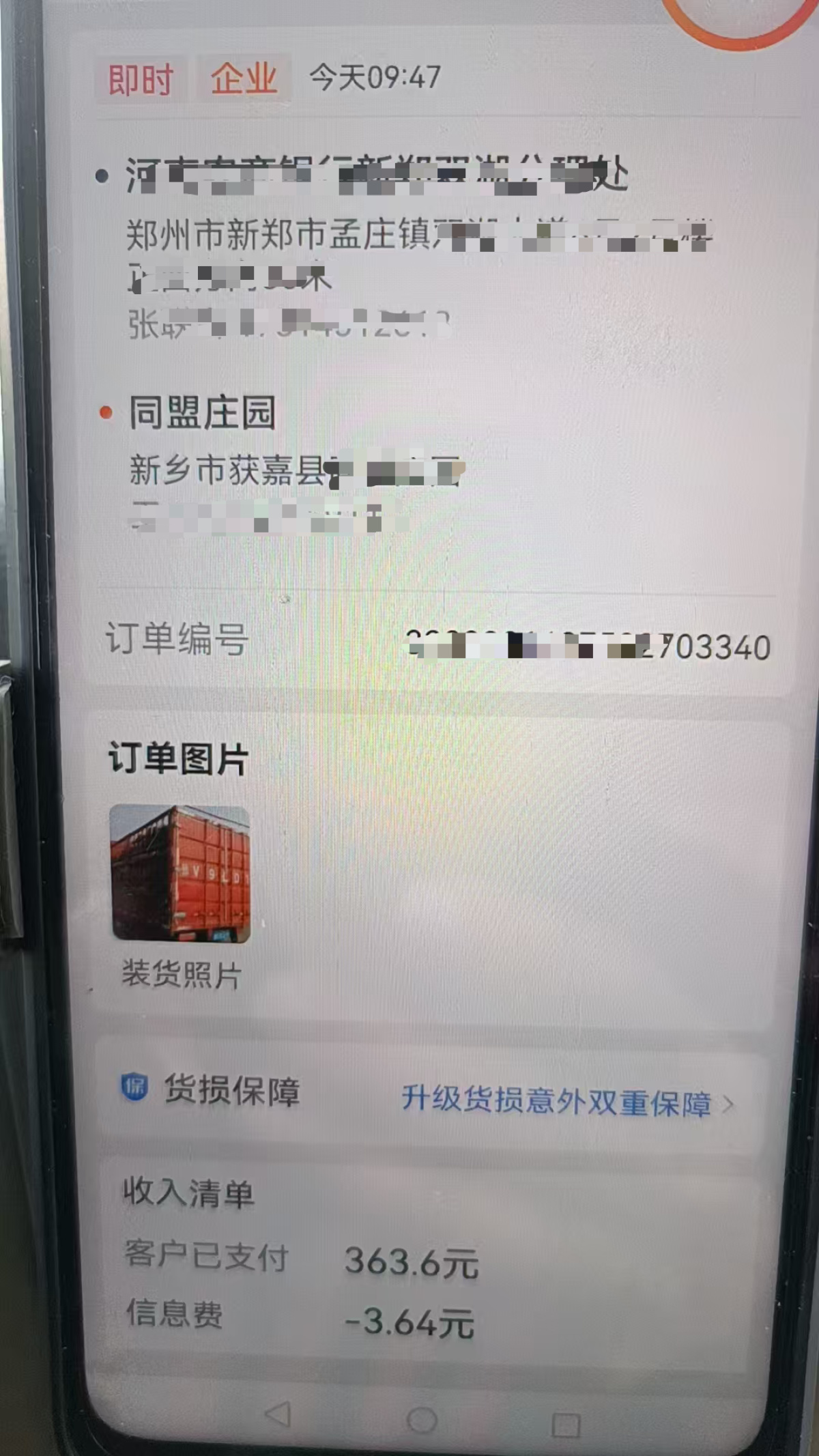 在李師傅和張先生提供的照片和截圖中,記者看到,照片和截圖的訂單編號、拉貨地址、送貨地址、聯(lián)系人、聯(lián)系電話等信息均一致。但張先生截圖中顯示的費(fèi)用信息是已支付400元,且轉(zhuǎn)跳到費(fèi)用明細(xì)頁面顯示的總計(jì)費(fèi)也為400元,并未有其他扣費(fèi)明細(xì);在李師傅照片中顯示的客戶已支付363.6元,信息費(fèi)-3.64元。