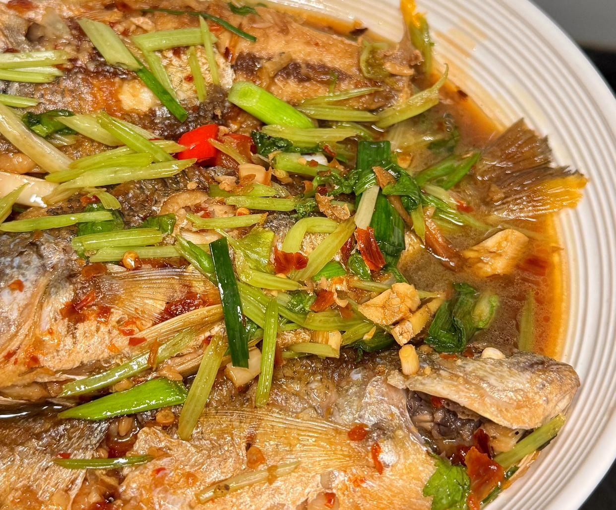 食材:黃翅魚一條(選活潑新鮮的,魚鰓紅、魚眼亮的那種)、姜絲、蒜末、小米辣、芹菜、蒜葉