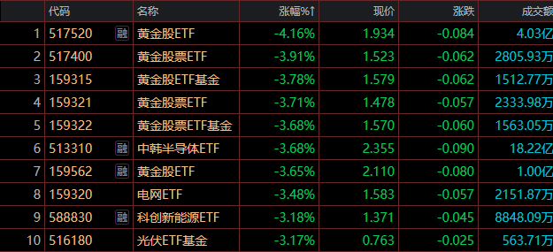 黃金股ETF(517520)領跌4.16%,黃金股票ETF(517400)跌3.91%,黃金股ETF基金(159315)跌3.78%。