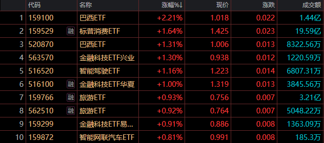 ETF收盤漲跌不一,巴西ETF(159100)領漲2.21%,標普消費ETF(159529)漲1.64%,巴西ETF(520870)漲1.31%。