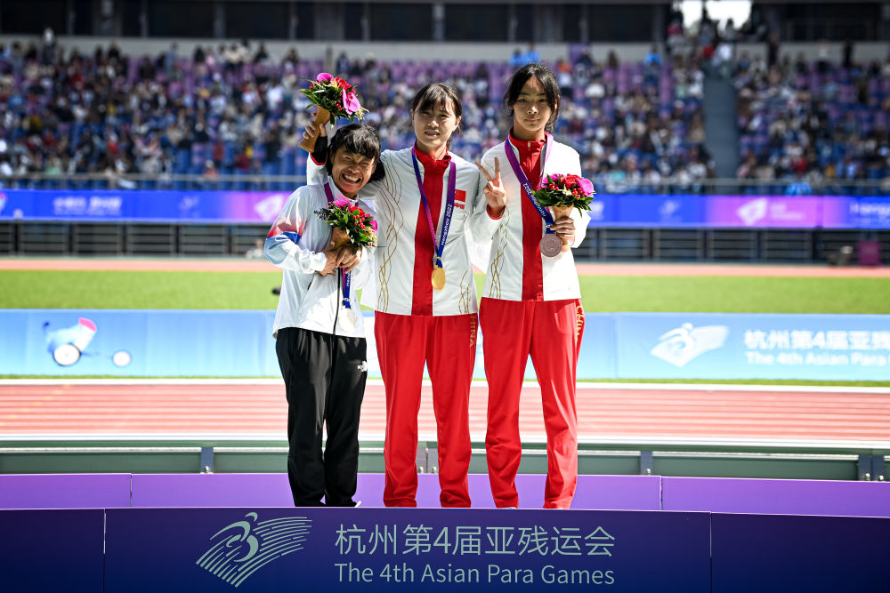 ↑2023年10月23日,杭州亞殘運會女子200米-T36比賽銅牌得主中國選手李四雙(右一)在頒獎儀式上合影。新華社記者 江漢 攝