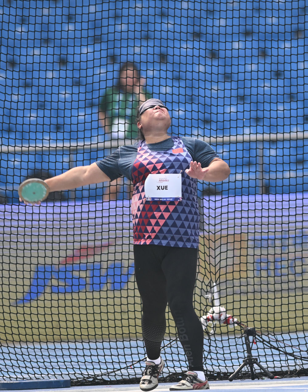 ↑2024年9月3日,薛恩慧在巴黎殘奧會田徑女子鐵餅F11級決賽中試投。新華社記者 賀燦鈴 攝