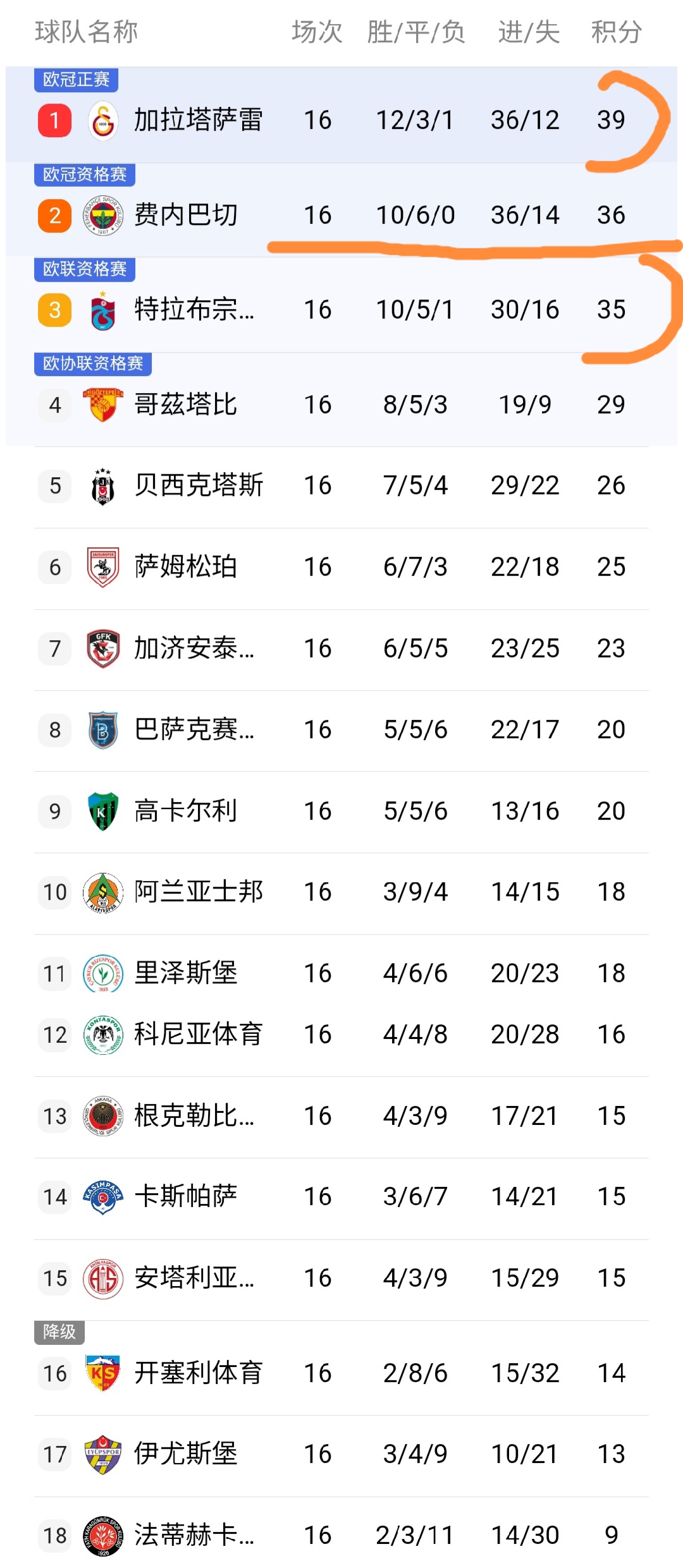 今天凌晨,土超第16輪結束了最后一場的比賽,在這場比賽結束之后,土超所有球隊都已經踢完了前16輪的比賽,我們來看看16輪之后土超最新積分排名情況。