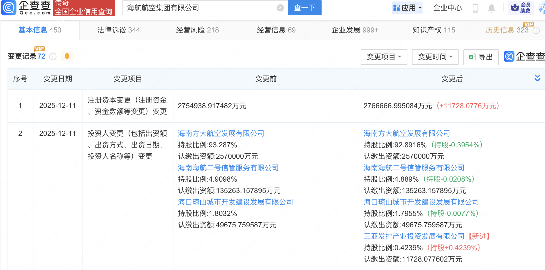 企查查APP顯示,近日,海航航空集團有限公司發生工商變更,新增三亞發控產業投資發展有限公司為股東,同時注冊資本增至約276.7億元。企查查信息顯示,該公司成立于2009年,經營范圍包含:智能無人飛行器銷售;人工智能公共服務平臺技術咨詢服務等,目前大股東為海南方大航空發展有限公司,持股92.89%。