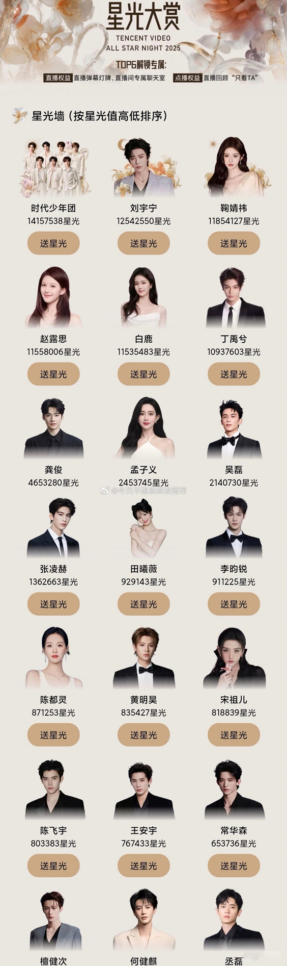 2025年,星光大賞投票順利收官,TOP6名單一公布,各家都在瘋狂吶喊要求去水,為此騰訊特意公布了去水補充條款。