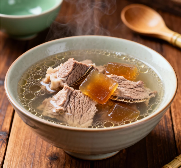 做法:先將瘦肉燉煮1小時(shí),取燉好的熱肉湯一碗,將事先烊化好的鱉甲膠液兌入湯中,加少許鹽調(diào)味即可食用。注意,膠液應(yīng)在湯燉好后再加入,不要長時(shí)間燉煮。