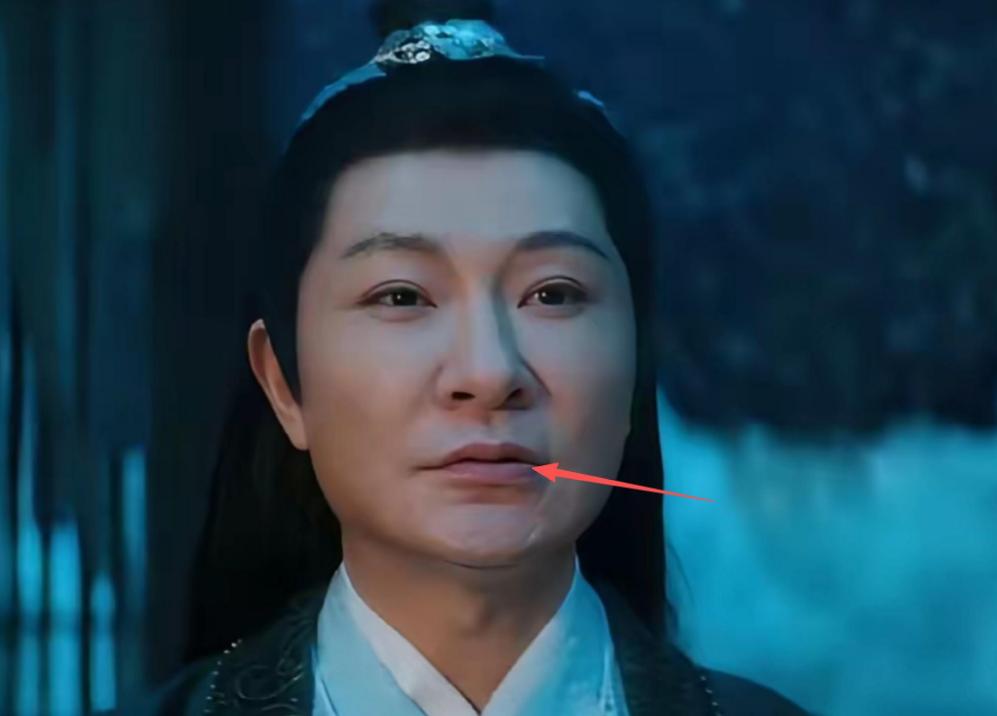 鏡頭里是藍(lán)色背景配一身藍(lán)布衣,色調(diào)本來夠陰冷了,結(jié)果正臉一露,那張臉腫得像剛出鍋的發(fā)面饅頭,飽滿得特別不自然,連額頭都亮得反光。