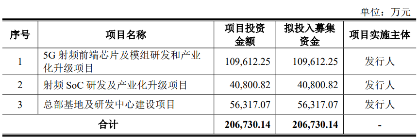 招股書顯示,昂瑞微此次IPO擬募集資金約20.67億元用于5G射頻前端芯片及模組研發和產業化升級項目、射頻SoC研發及產業化升級項目和總部基地及研發中心建設項目的建設,有助于進一步提高公司自主創新能力,增強公司技術儲備,完善產品布局,以技術升級提升公司產品的核心競爭力。