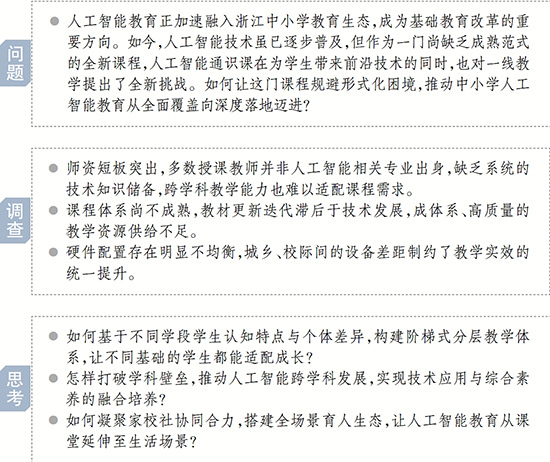 如何讓課程既符合政策要求,又能適配中小學(xué)教育規(guī)律?怎樣在技術(shù)普及與教學(xué)實效間找到平衡?帶著這些問題,記者走訪浙江多地中小學(xué)、教研機構(gòu),與一線教師、教育專家深入交流,探尋如何上好一堂人工智能通識課。