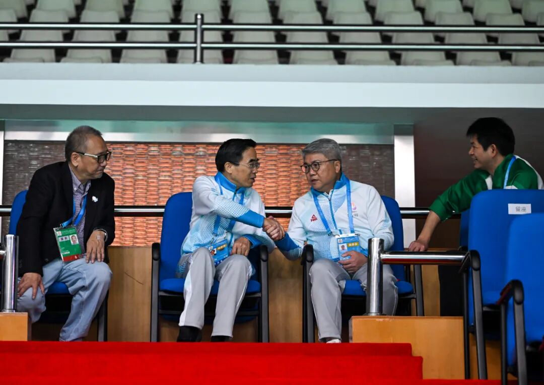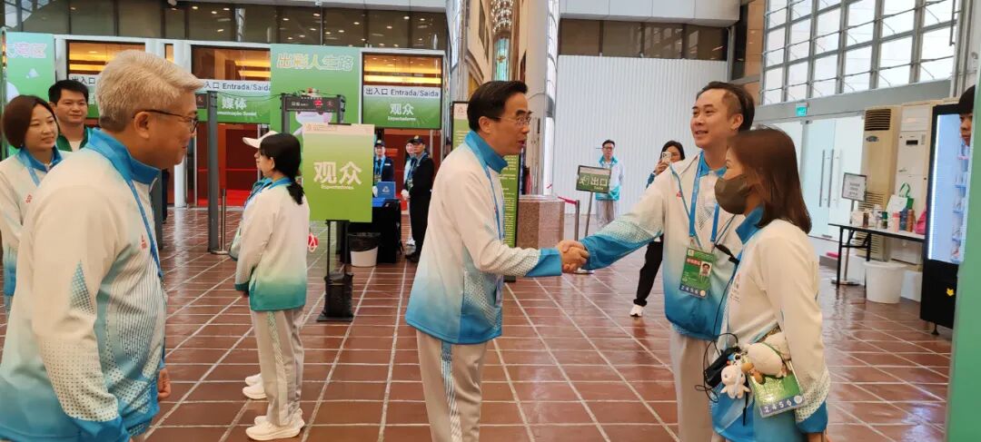 12月13日上午,程凱在澳門綜藝館,觀看特奧羽毛球比賽,看望慰問工作人員、志愿者,并與在此觀賽的蘇炳添交流。