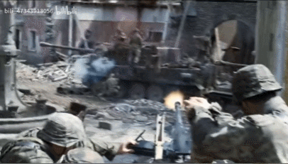 然后日軍坦克在巷戰中遇到各種困難,比如轉向、倒車不便,炮塔旋轉時炮管被墻壁卡住等等,有一個亮點是,第一次在電影中看到97式坦克炮塔的尾部機槍開火畫面。