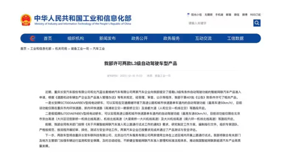 12月15日,工業(yè)和信息化部官網(wǎng)消息顯示,我國首批L3級有條件自動駕駛車型準(zhǔn)入許可正式公布,分別為長安牌SC7000AAARBEV型純電動轎車、極狐牌BJ7001A61NBEV型純電動轎車。兩款車型將在北京、重慶開展上路試點(diǎn),標(biāo)志著L3級自動駕駛從測試階段邁入商業(yè)化應(yīng)用。