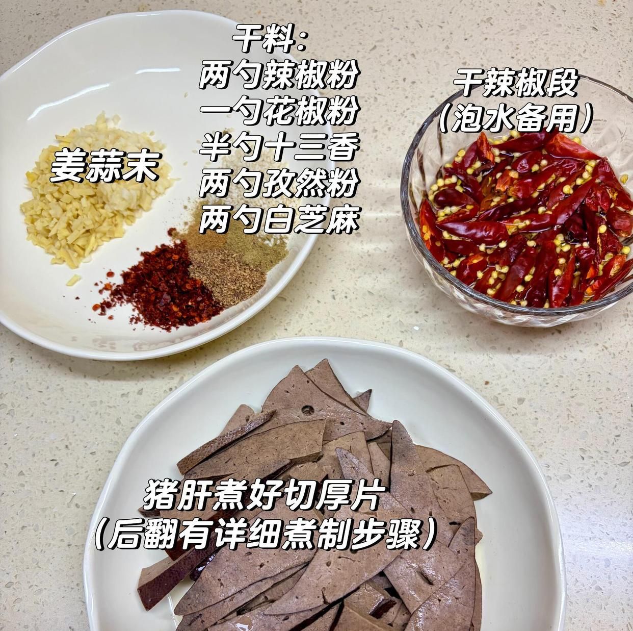 豬肝、蔥、姜、八角、香葉、生抽、老抽、鹽、食用油、干辣椒段、姜蒜末、糖、辣椒粉、花椒粉、孜然粉、白芝麻、味精。