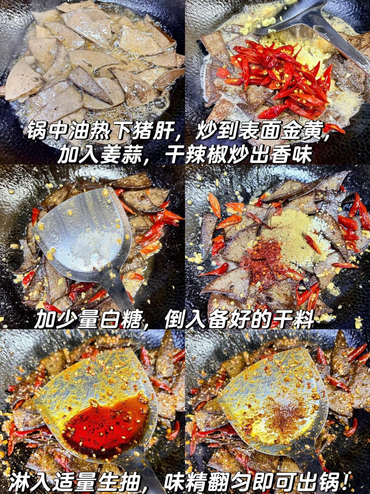 二是能讓干辣椒更加濕潤,炒出來的香味更加濃郁。繼續翻炒,讓姜蒜末和干辣椒段的香味充分釋放出來,與豬肝片完美融合。