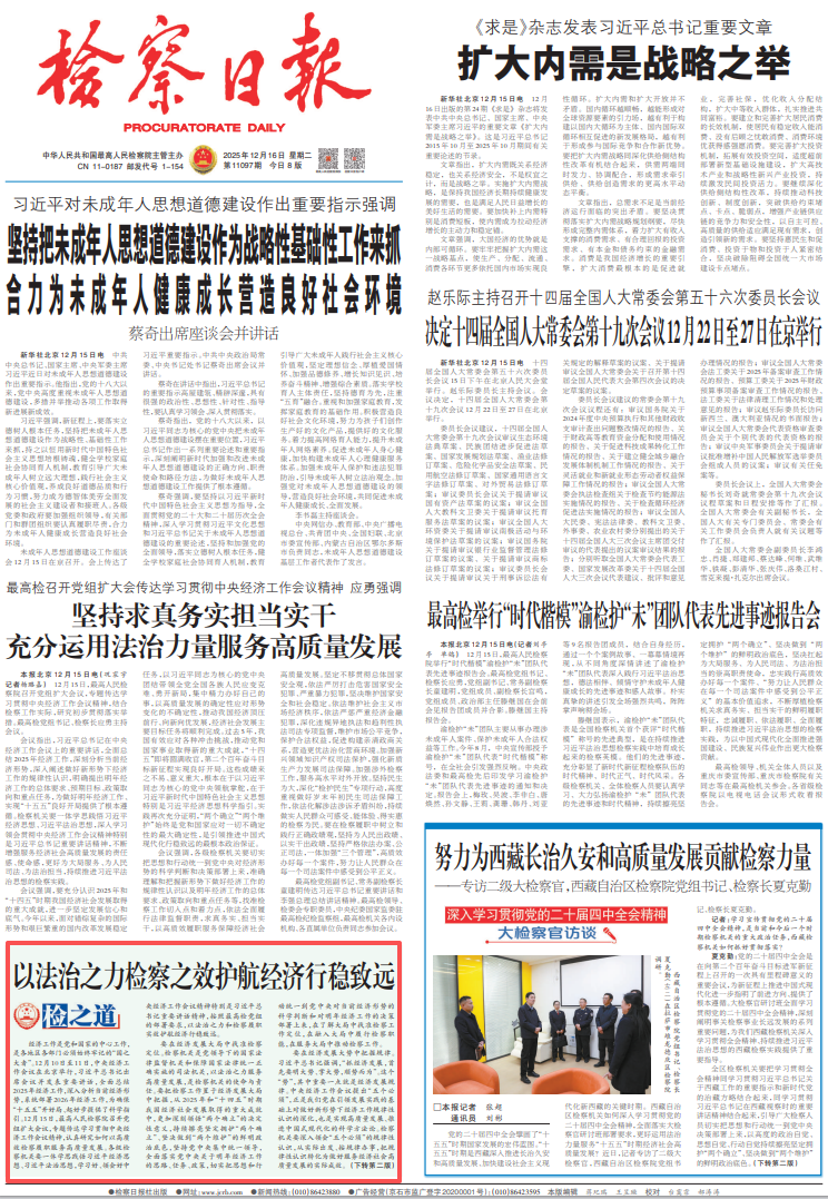 經濟工作是黨和國家的中心工作,是各地區各部門必須始終牢記的“國之大者”。12月10日至11日,中央經濟工作會議在北京舉行,習近平總書記出席會議并發表重要講話,全面總結2025年經濟工作,深入分析當前經濟形勢,系統部署2026年經濟工作,為確保“十五五”開好局、起好步提供了科學指引。12月15日,最高人民檢察院召開黨組擴大會議,專題傳達學習貫徹中央經濟工作會議精神,認真研究如何以高質效檢察履職服務高質量發展。各級檢察機關要一體學思踐悟習近平經濟思想、習近平法治思想,學習好、領會好中央經濟工作會議精神特別是習近平總書記重要講話精神,按照最高檢黨組的部署要求,以法治之力和檢察履職實效護航經濟行穩致遠。