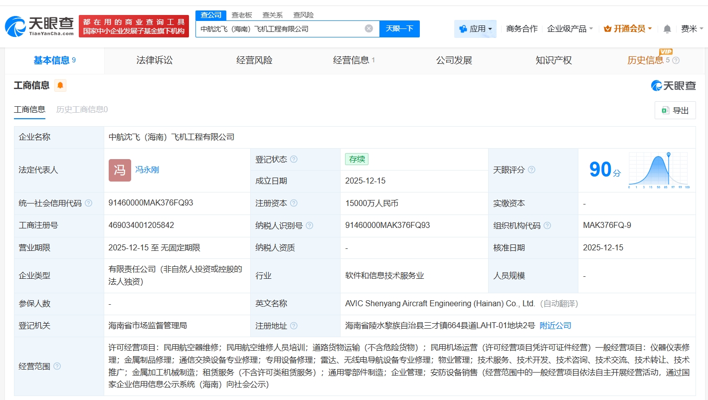 天眼查App顯示,近日,中航沈飛(海南)飛機工程有限公司成立,法定代表人為馮永剛,注冊資本1.5億人民幣,經營范圍包括民用航空器維修、民用航空維修人員培訓、民用機場運營等,由中航沈飛(600760)旗下沈陽飛機工業(集團)有限公司全資持股…