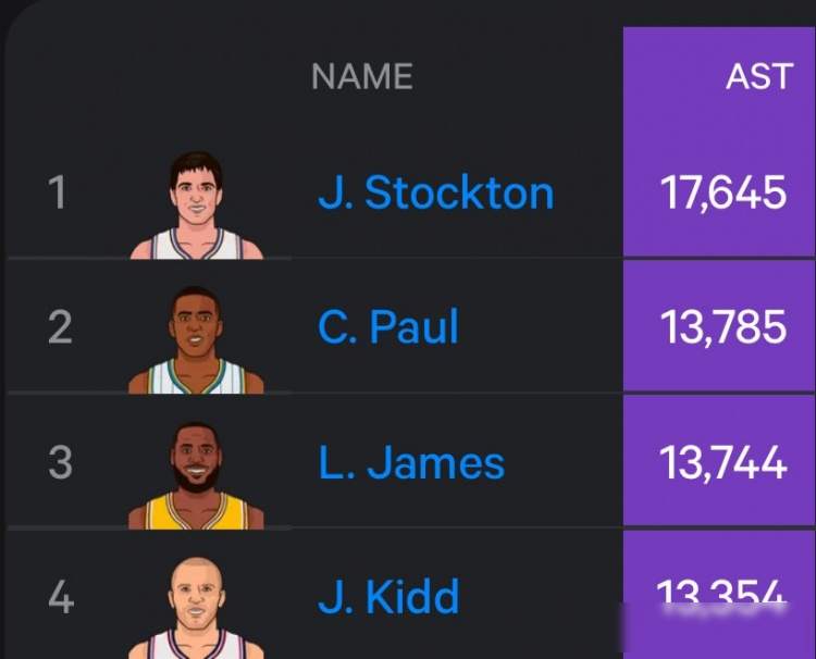 他在常規賽里助攻超過一萬次,季后賽也快到三千次,這兩項都是歷史第一,保羅的總助攻數是13785,詹姆斯現在是13744,就差那么一點點,關鍵是詹姆斯今年已經39歲,還能穩定每場送出7次以上助攻,這在NBA歷史上幾乎沒幾個人能做到,以前的助攻高手比如納什、基德,年紀大了數據就往下掉,詹姆斯反而能穩得住。