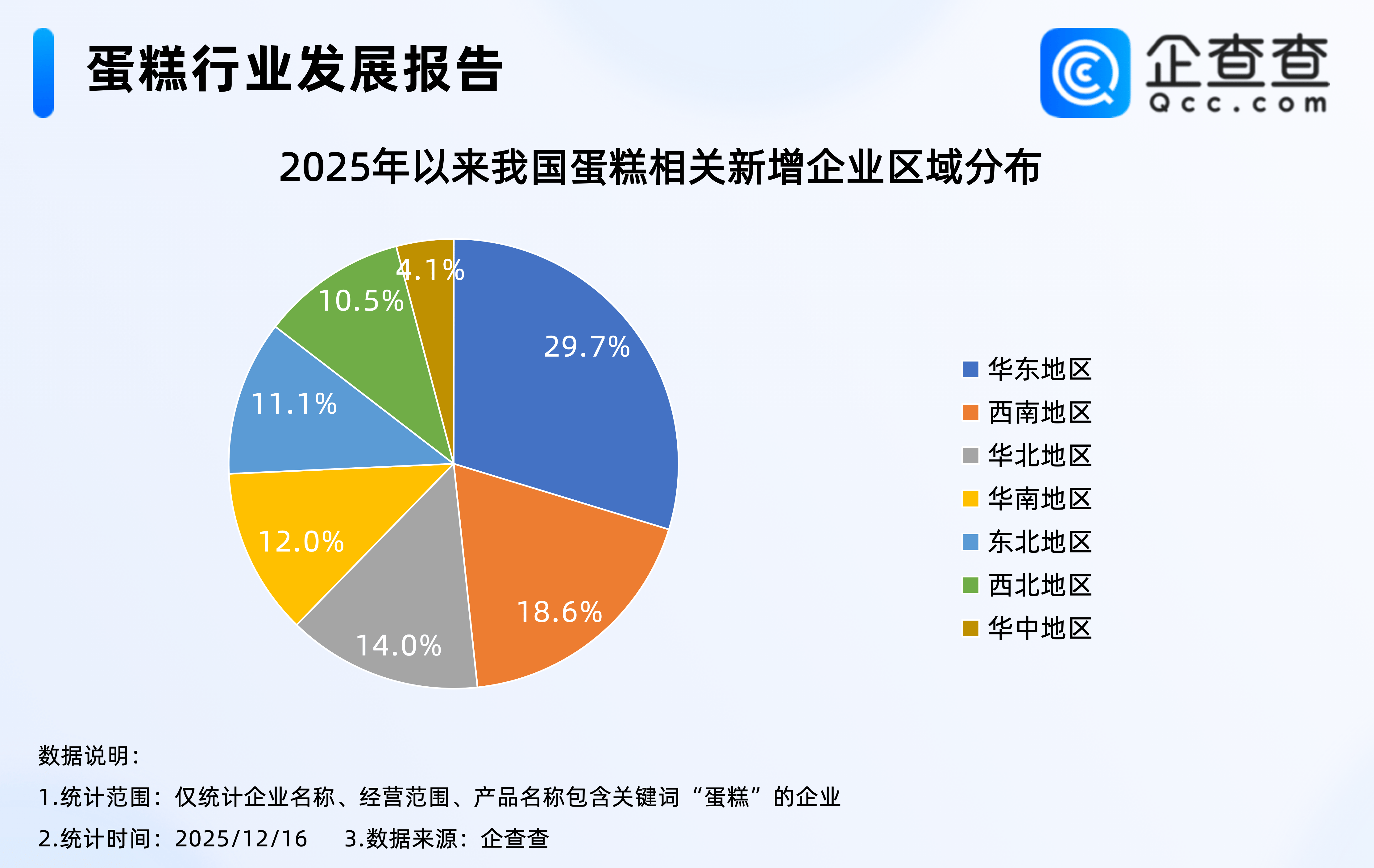 企查查數據顯示,截至12月16日,2025年我國已注冊2.35萬家蛋糕相關企業,其中,分布在華東地區的相關企業最多,占比29.7%,與總存量區域分布不同的是,2025年以來新注冊企業中,近20%的企業分布在西南地區,占比達18.6%,僅次于華東地區。