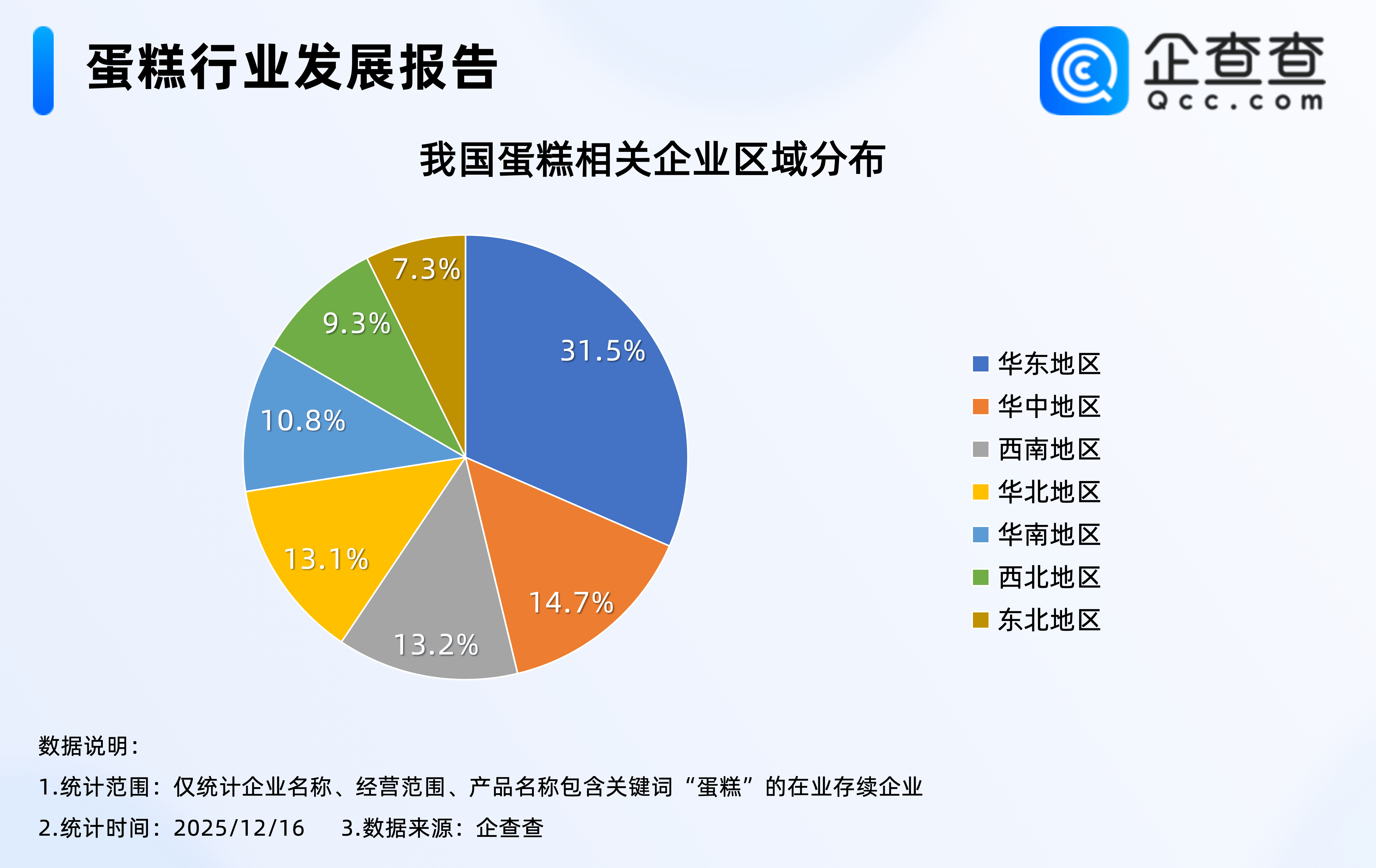 企查查數據顯示,區域分布上,我國華東地區現存蛋糕相關企業最多,占全國總存量的31.5%,其次是華中、西南地區,分別占比14.7%、13.2%,東北地區占比相對最少,為7.3%。