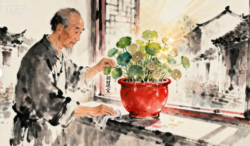 第二天一早,蘇明遠就去鎮上的花市,買了一盆銅錢草。這盆銅錢草長得很旺,綠油油的葉子像一個個小銅錢,擺放在紅色的陶瓷盆里,看著就喜人。他小心翼翼地把銅錢草放在客廳朝南窗臺的正中央,又給它澆了些水,看著葉片上的水珠,心里充滿了期待。