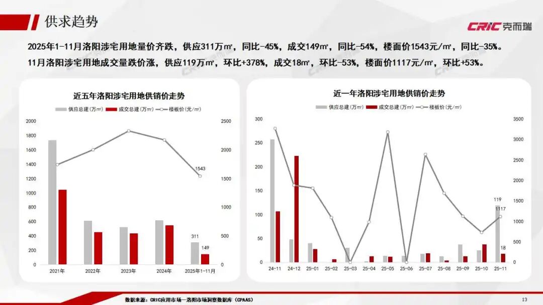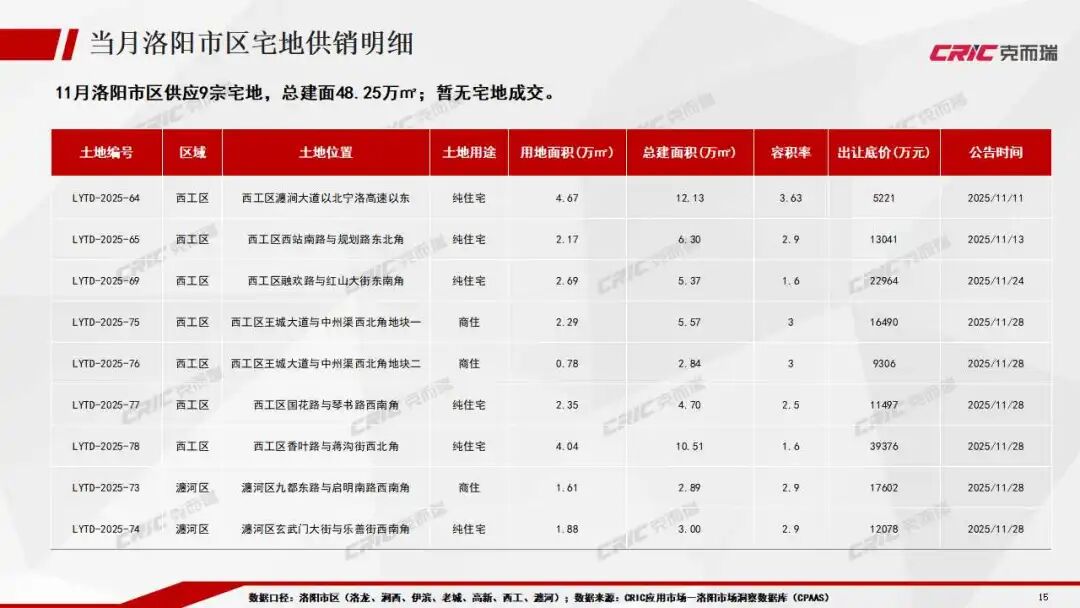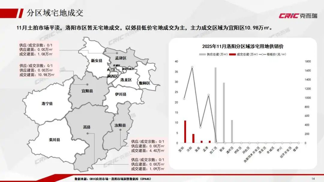 洛陽宅地供應量環比激增,成交量下滑,市場整體平淡。宅地成交主力轉移至宜陽等郊縣區域。受此結構性影響,當月樓面均價雖環比上漲53%,但仍處于低位,整體市場熱度不足。