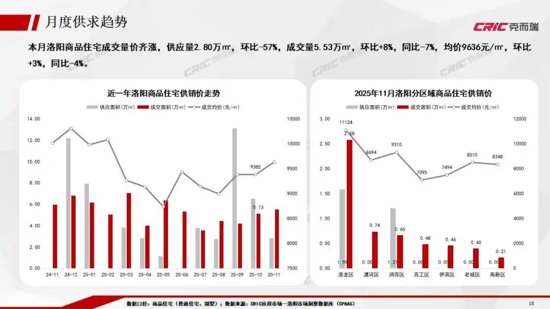 洛陽樓市成交量價環比回升,市場呈現修復性升溫,但各區域及項目間價格分化加劇。整體市場客戶觀望情緒濃厚,購房需求釋放緩慢,整體表現平淡。